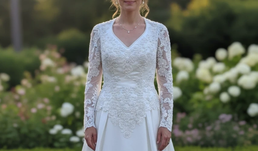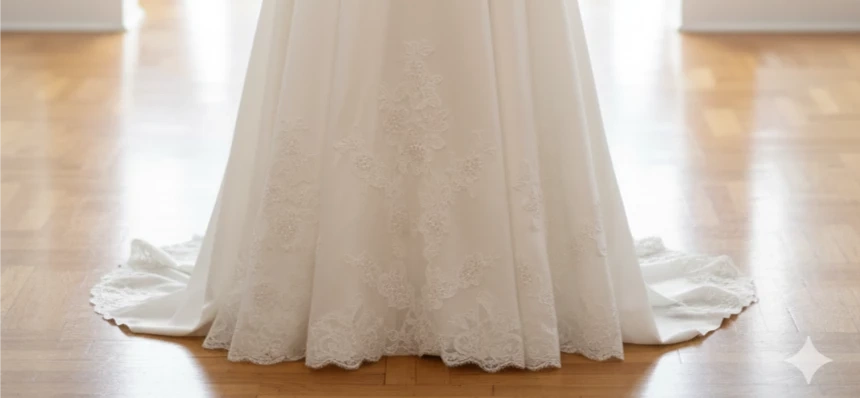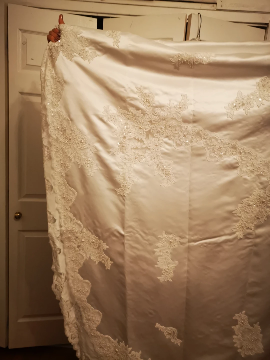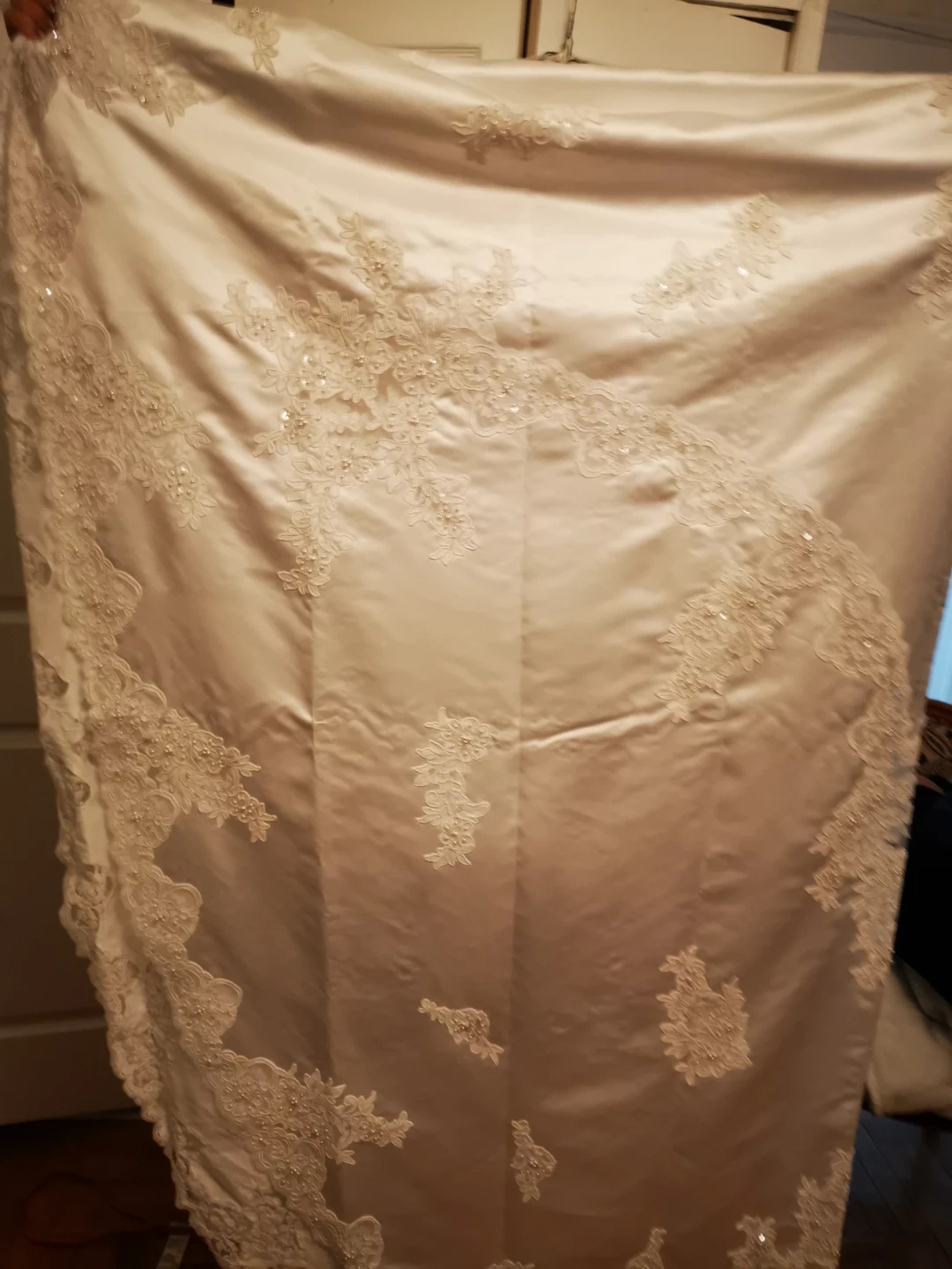 DAVID'S BRIDAL Beautiful wedding dress with delicate lace appliques. It's in great condition and ready for your special day! The dress is white and features intricate detailing.