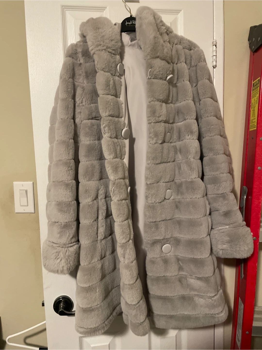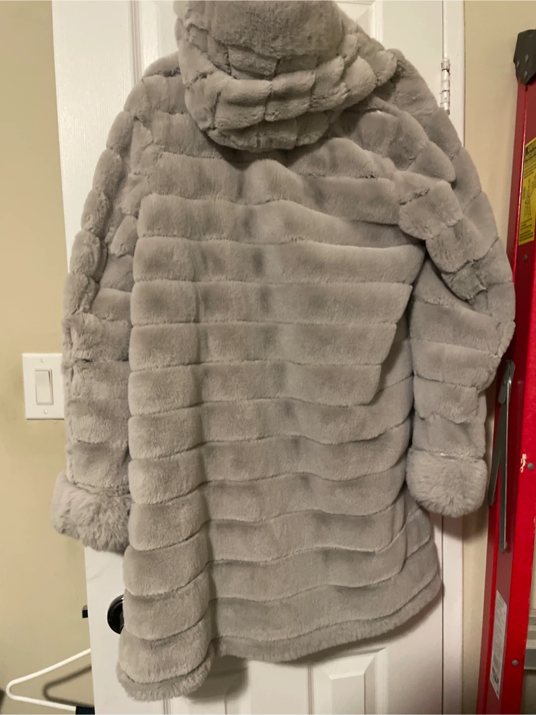 Grey faux fur coat with a hood. It's made of soft material. Coat buttons up the front. Great for keeping warm in cooler weather!