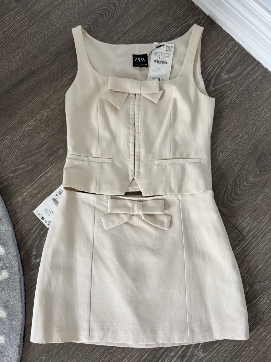 This cream set from ZARA includes a vest and a skirt, both featuring a cute bow detail. It's size XS. The material appears to be a linen blend. Perfect for a chic summer outfit!