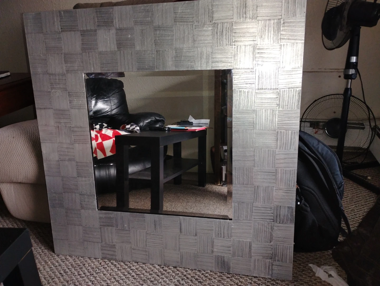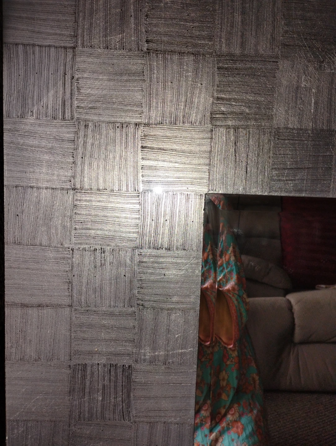 This square wall mirror features a unique textured silver frame. The frame's woven pattern adds a stylish touch to any room. It's ready to hang and would be a nice addition to a hallway or living area.