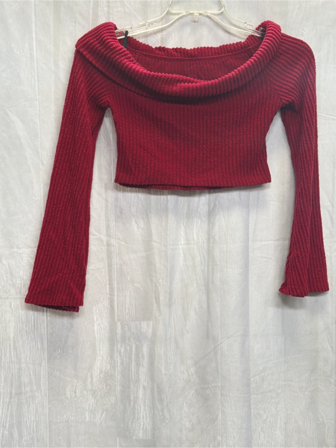 Red off-the-shoulder sweater with long sleeves. It's a ribbed knit crop style. Material is a soft, stretchy blend.