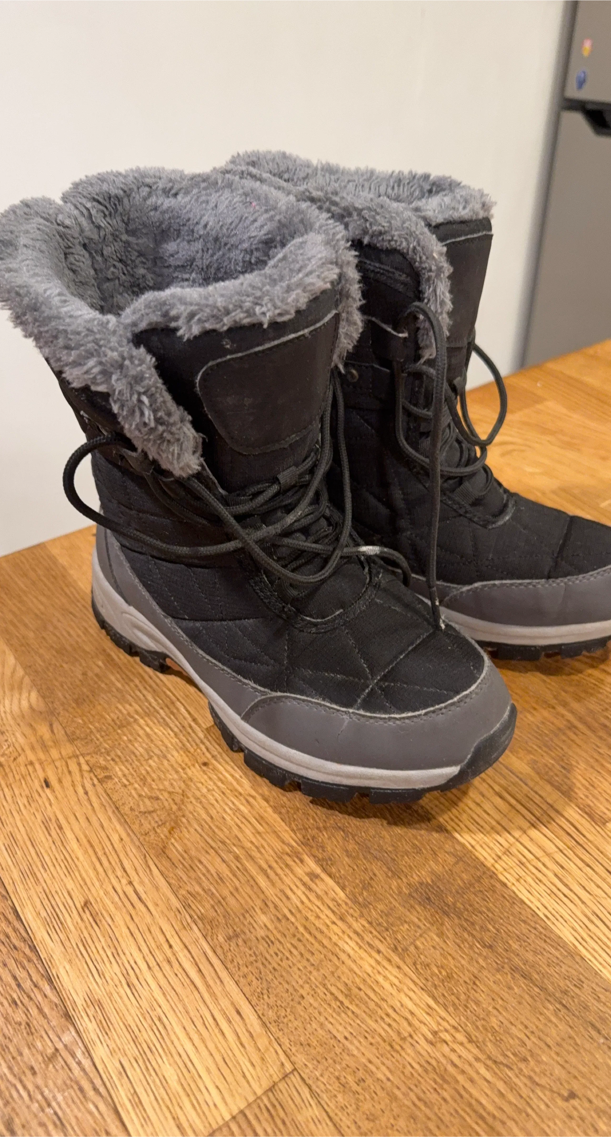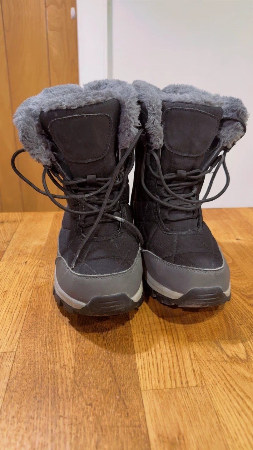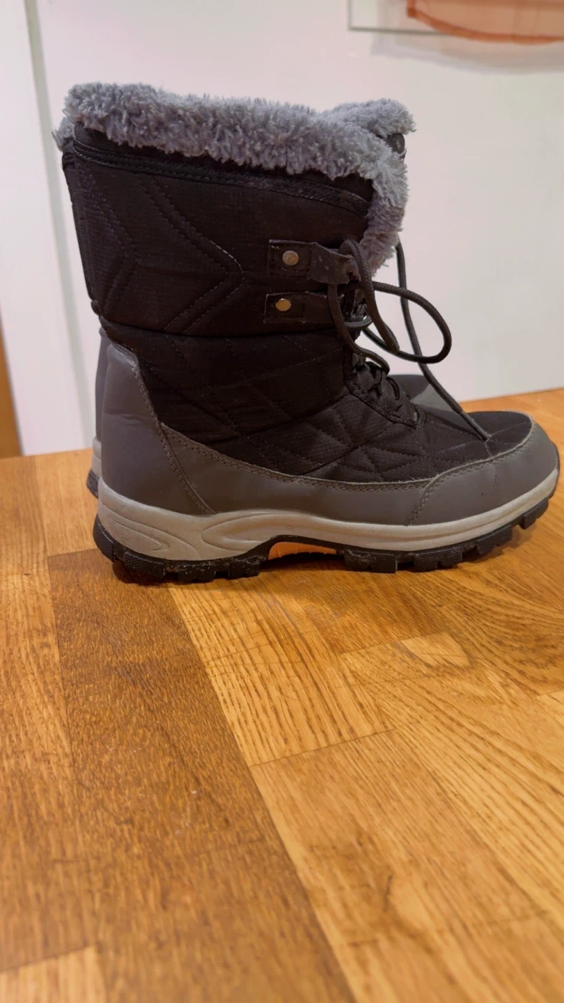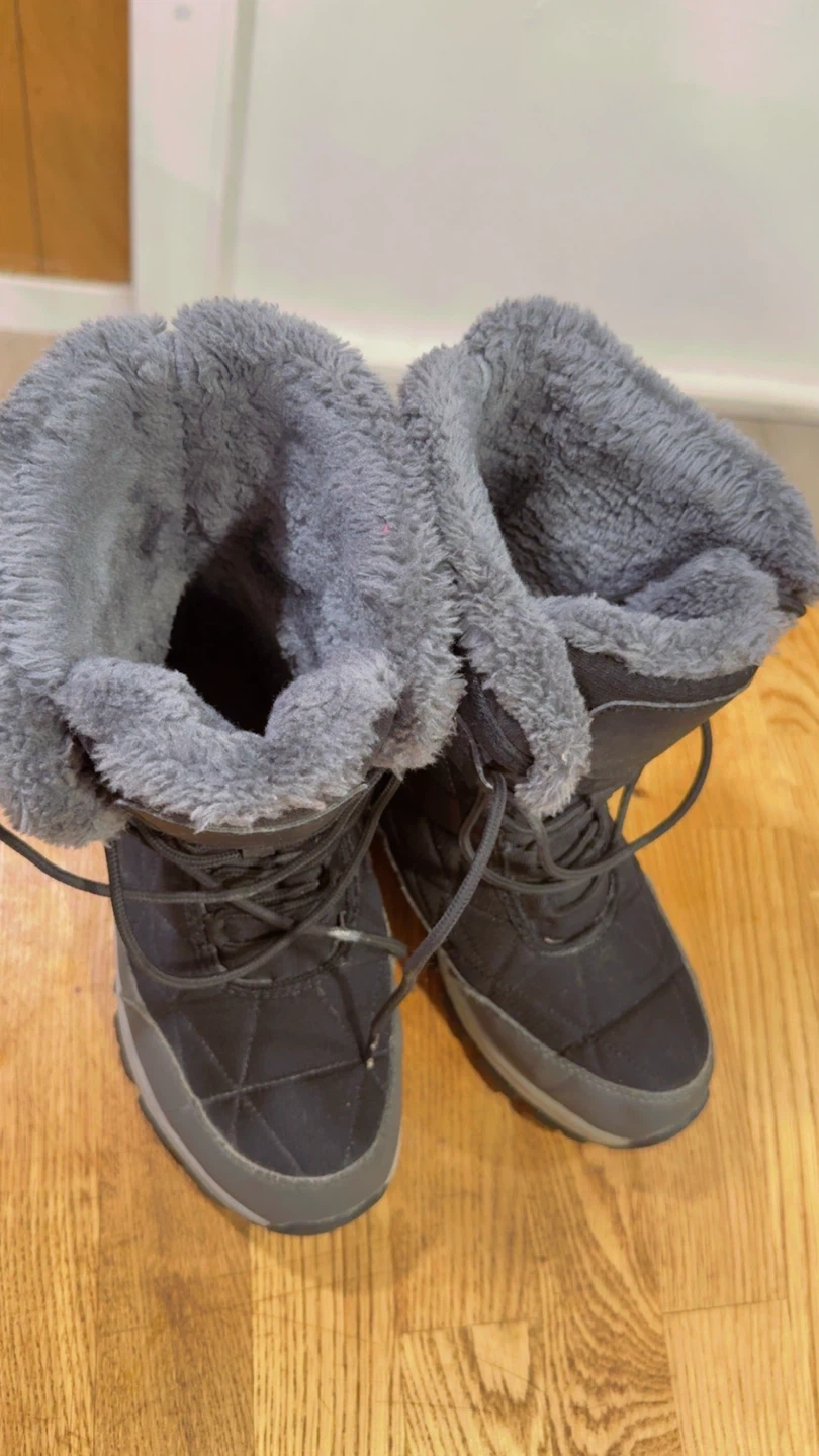 Warm black winter boots with plush grey fur lining. Features a durable tread for winter conditions. These boots will keep your feet toasty when it's cold out!