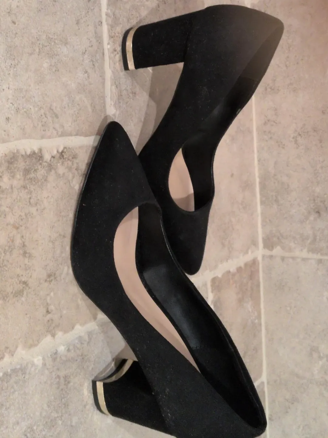 Women's black block heel pumps. These heels feature a pointed toe and a gold accent on the heel. The material is vegan suede.