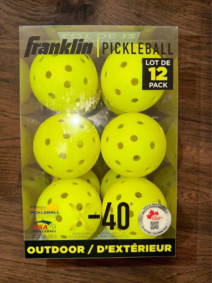 New Franklin X-40 pickleballs. This is a 12 pack of performance outdoor pickleballs. They are official balls for USA Pickleball and Pickleball Canada. Retail price is $49.97. Pickup in Callaghan neighborhood SW.