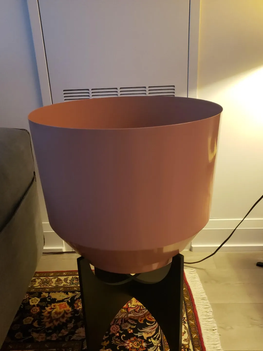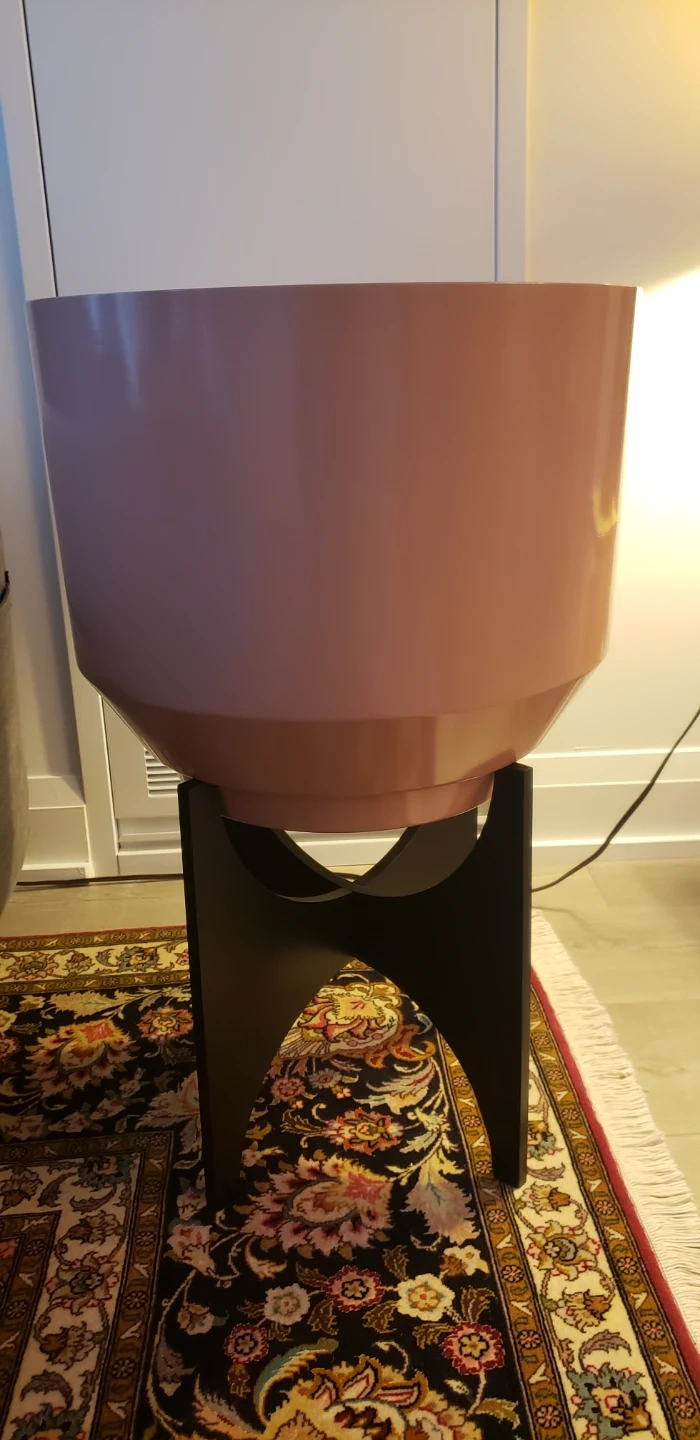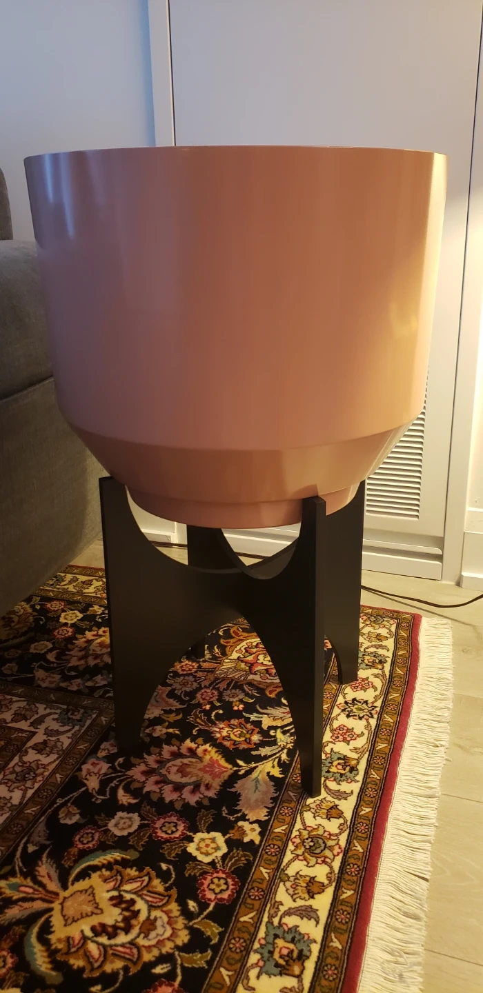 Matte pink metal planter made of aluminum (light weight) with solid wooden legs painted black. Beautiful.