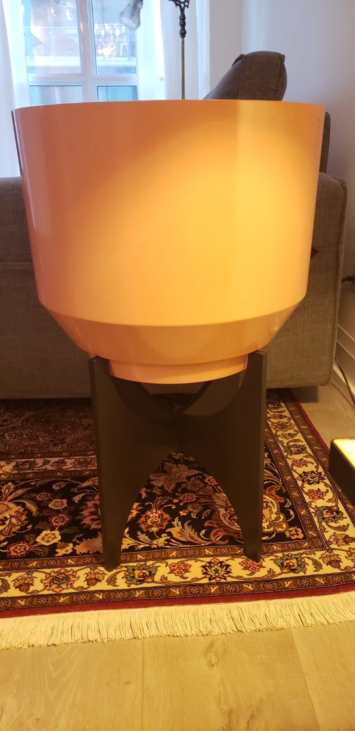 Matte pink metal planter made of aluminum (light weight) with solid wooden legs painted black. Beautiful.