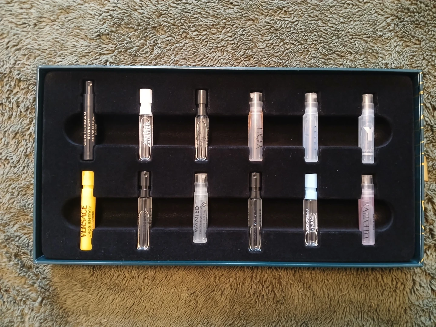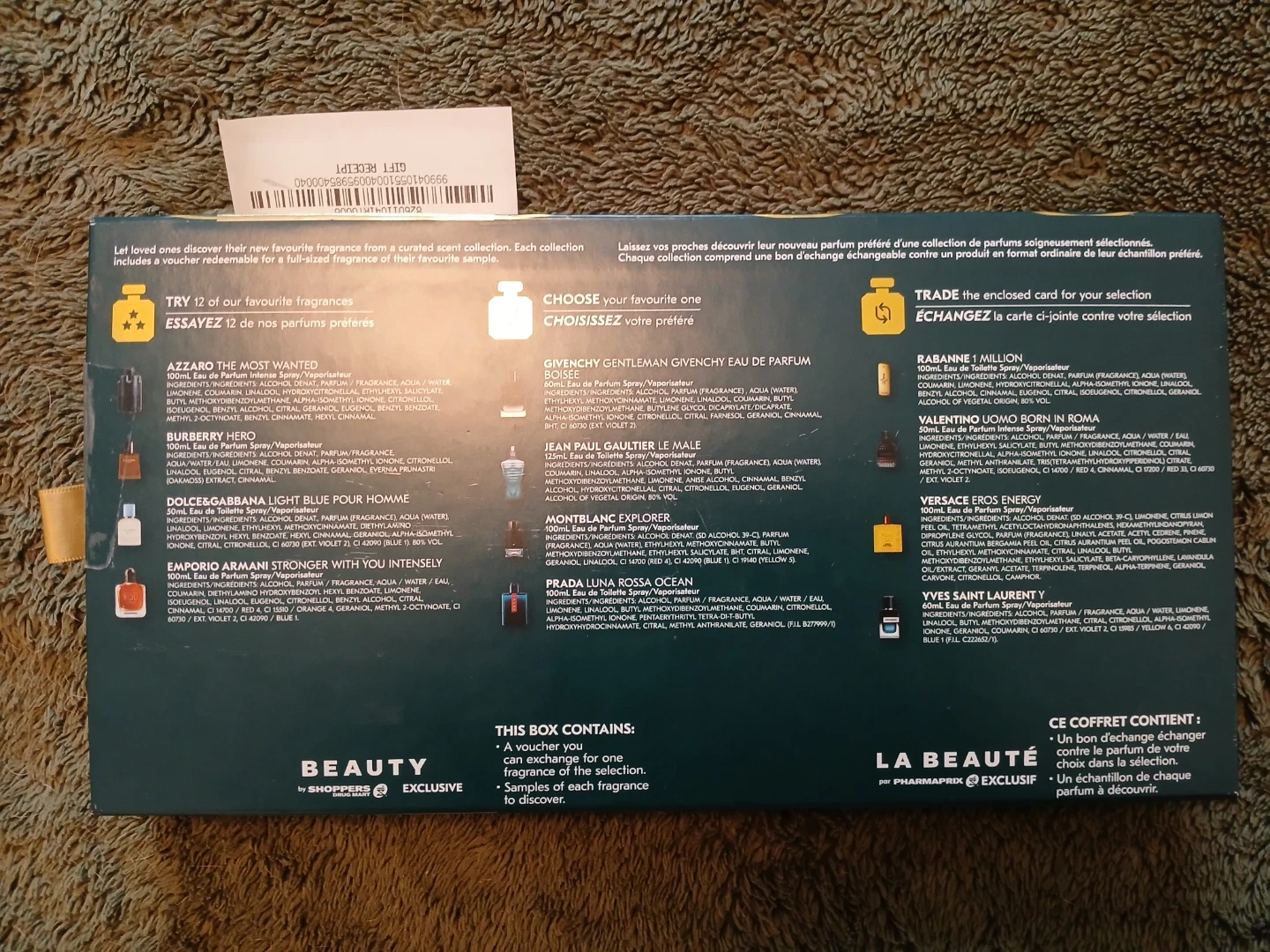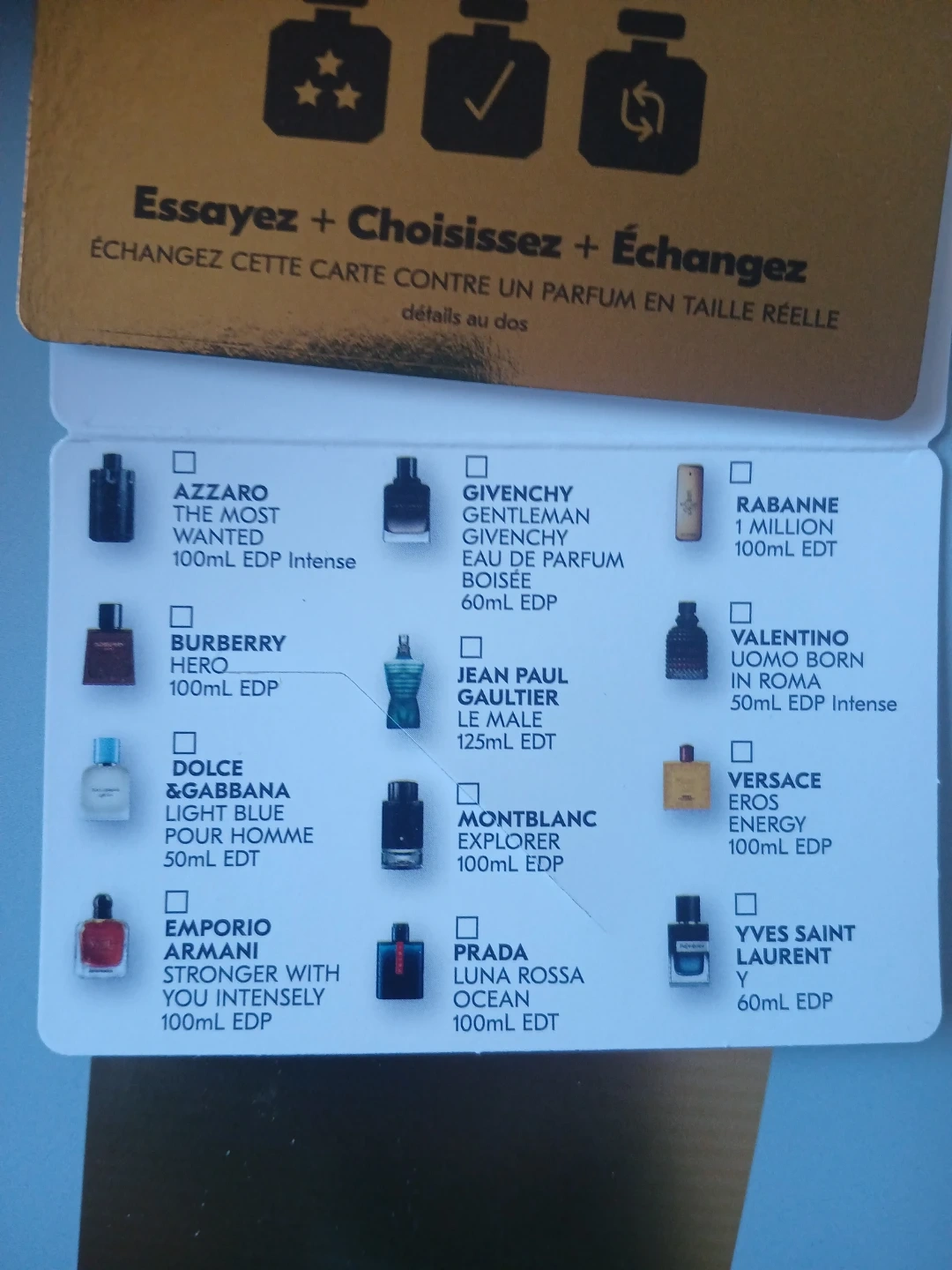 Contains 12 assorted sample-sized perfumes and an unredeemed Try, Choose, Trade card.