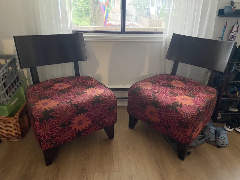 Buy & SellPair of Floral Accent ChairsPair of Floral Accent ChairsFreeTwo chairs with dark wood frames and floral fabric upholstery. Pick up onlyConditionGoodWHERE TO MEETCheck LocationView MapSELLEREmmaDanforth E York24424 reviews3 chats·3 favorites·185 viewsSEND CHAT TO SELLERHi Emma! I’m interested in your listing.Hi Emma! I’m interested in your listing.Get the Karrot app to chatSign In to chat