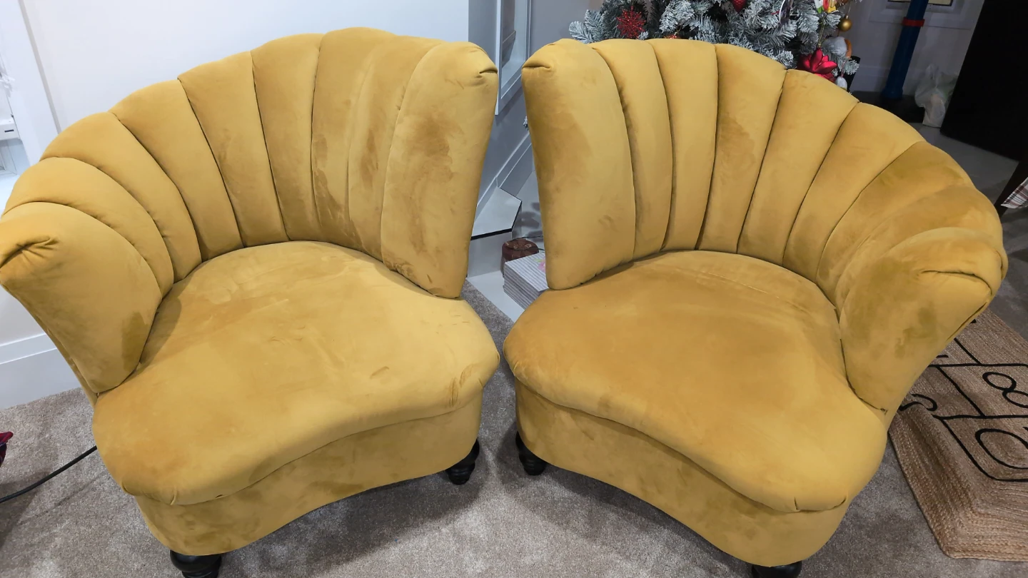 Selling a pair of yellow velvet accent chairs. These chairs have a unique shell-back design and a plush velvet finish. They're comfortable and stylish additions to any living space. Velvet material.