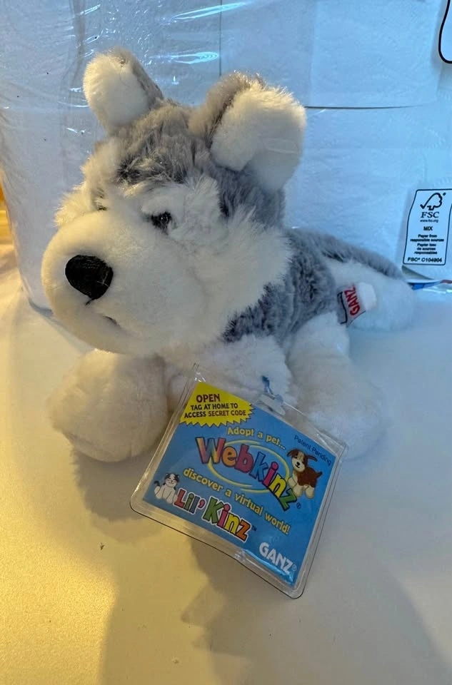 This is a cute Webkinz Lil Kinz Husky plush toy. It comes with a special code that can be used to unlock the virtual pet online. Great for collectors or kids who love stuffed animals. Let me know if you're interested!