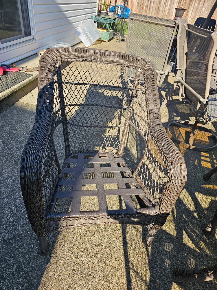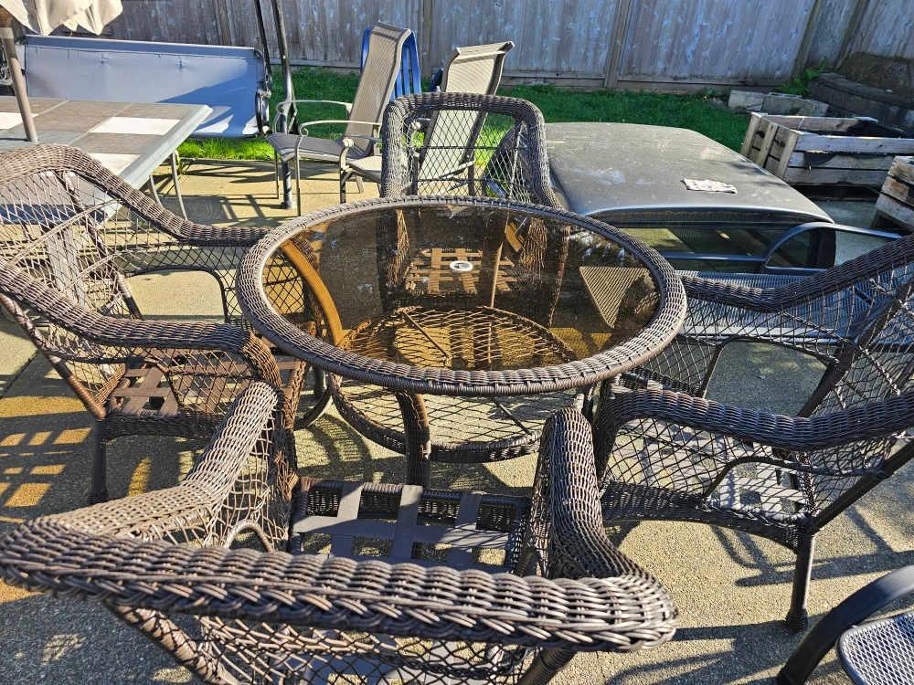 very good condition, glass wicked table with 4 chairs, cushion very clean well kept. no umbrella. Will delivery within mission and abbotsford.