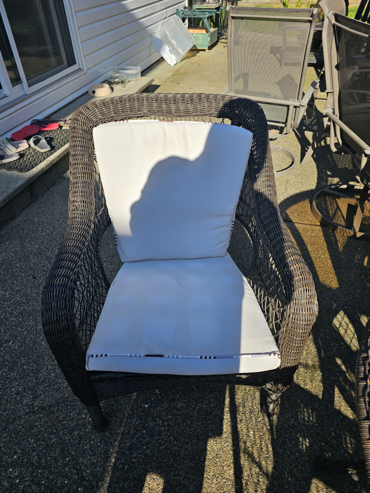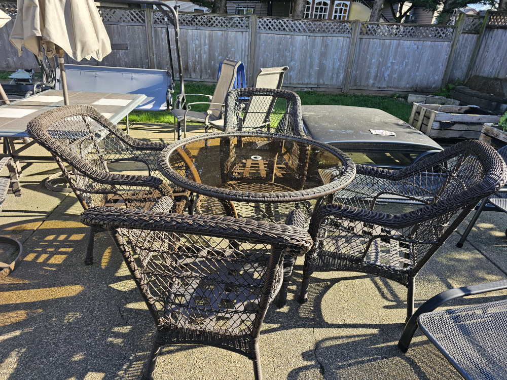 very good condition, glass wicked table with 4 chairs, cushion very clean well kept. no umbrella. Will delivery within mission and abbotsford.