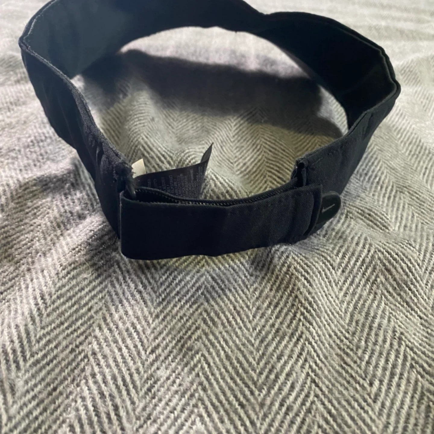 Black Nike Golf visor with adjustable strap. Features the Nike swoosh logo. Great for sunny days on the course!