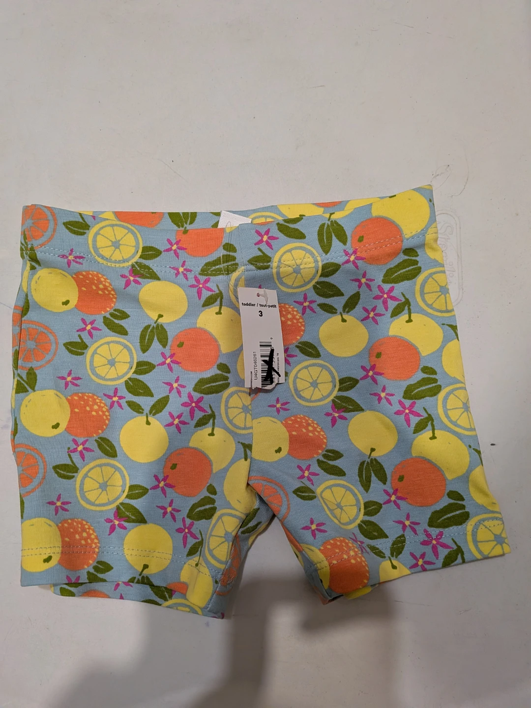 These toddler shorts feature a vibrant citrus fruit and floral print on a light blue background. They're a size 3. The fabric is soft and stretchy for comfort.