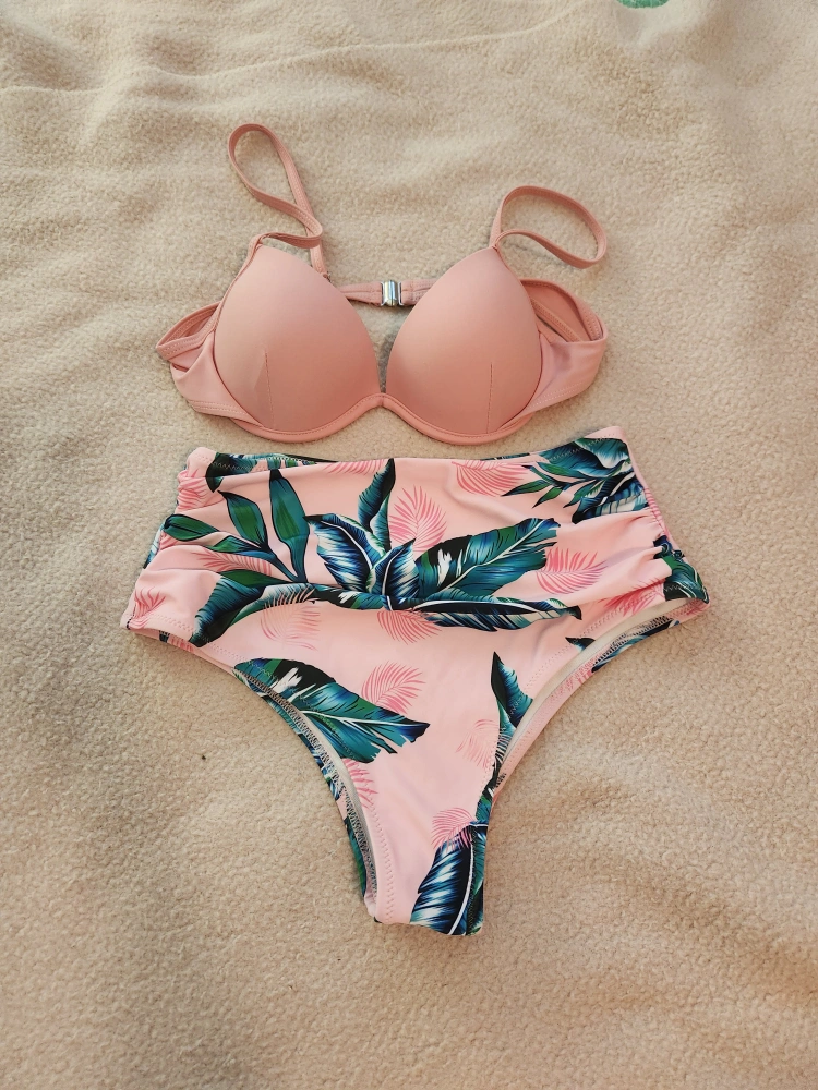 Pink bikini top with a tropical print bottom. The top has adjustable straps and a clasp closure in the back. The bottom is a high-waisted style.