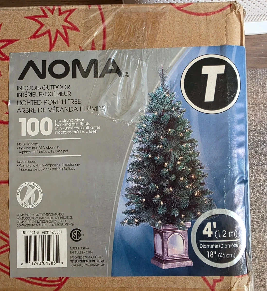 Selling a NOMA 4ft indoor/outdoor lighted porch tree. It's pre-strung with twinkling mini lights. The box includes 143 branch tips and includes 4 x 2.5V clear mini replacement bulbs & 1 plastic pot. Diameter/Diamètre: 18" (46 cm)