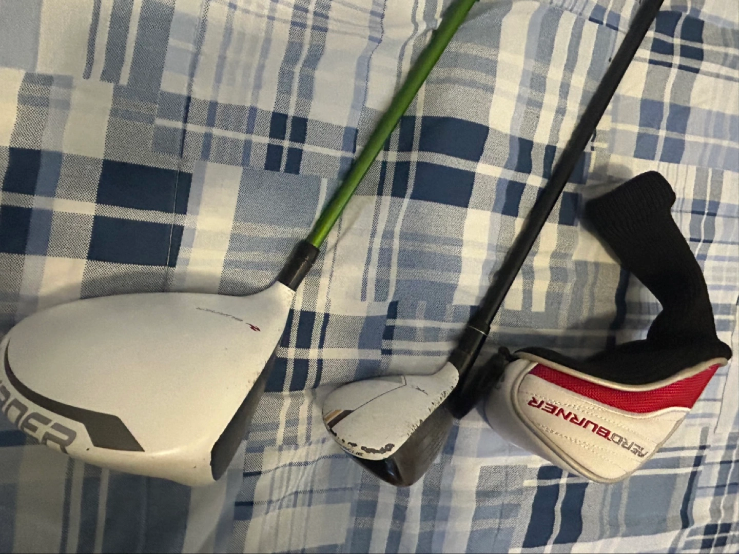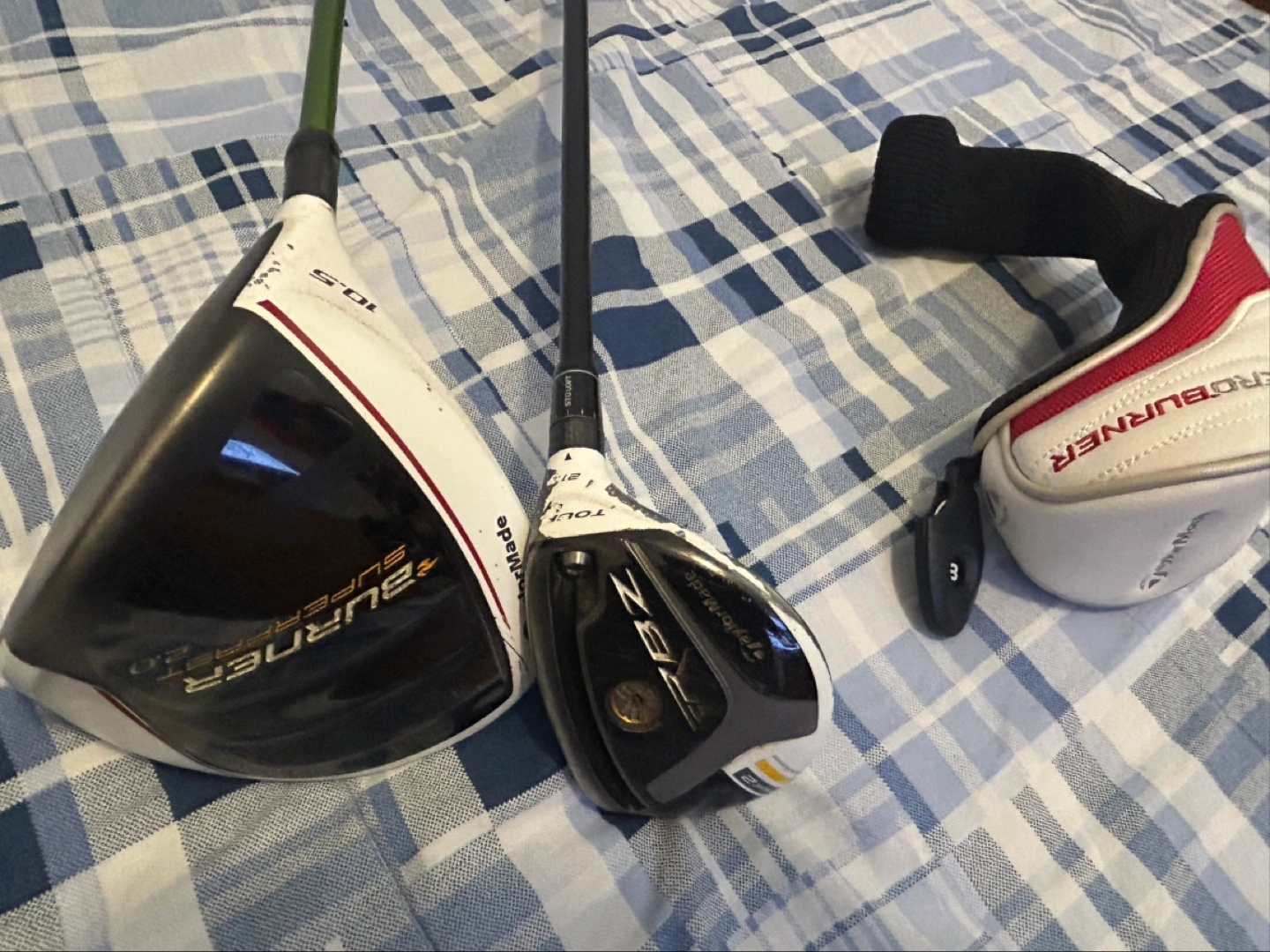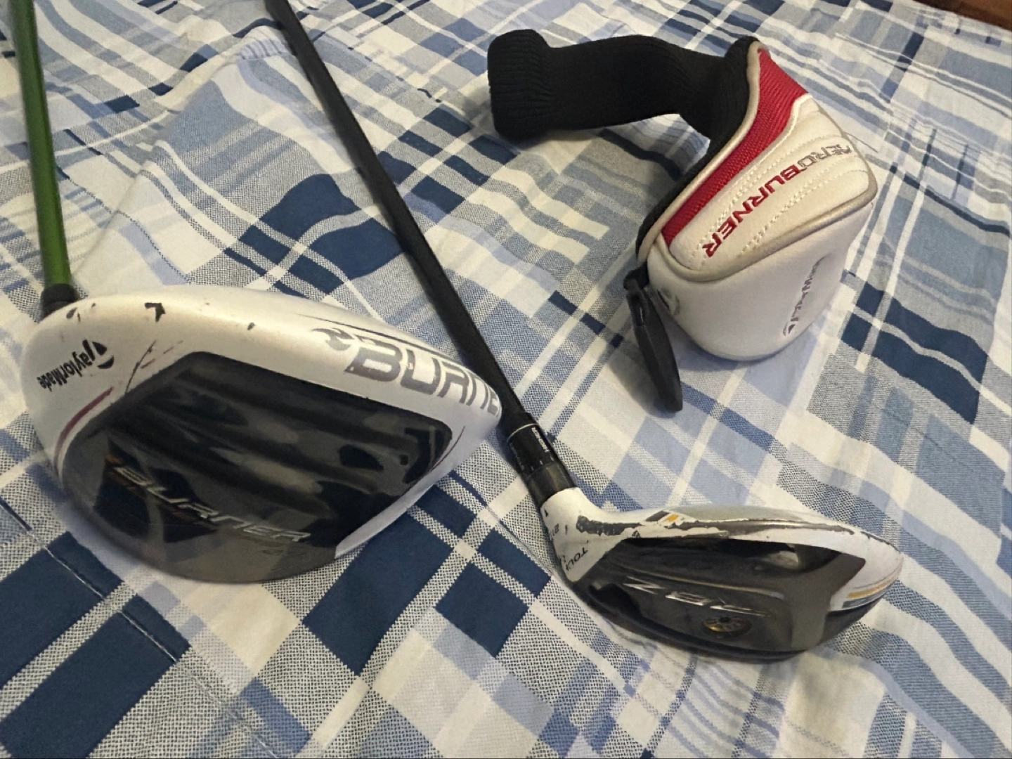 Includes a TaylorMade Burner SuperFast 2.0 driver and a TaylorMade AeroBurner rescue club. Both clubs are in used condition. A protective headcover is included for the rescue club.