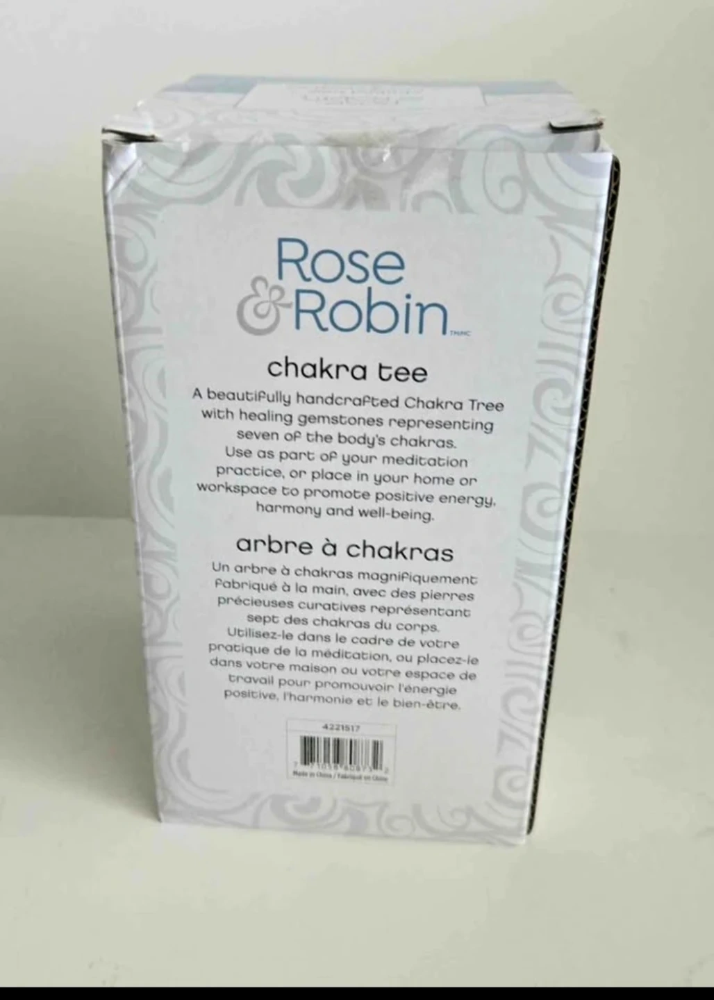 Rose & Robin handcrafted Chakra Tree. Features healing gemstones representing seven of the body's chakras. It's 7.5" (19 cm) tall and made with a wooden base and pliable copper wire branches. Use it for meditation or to promote positive energy.