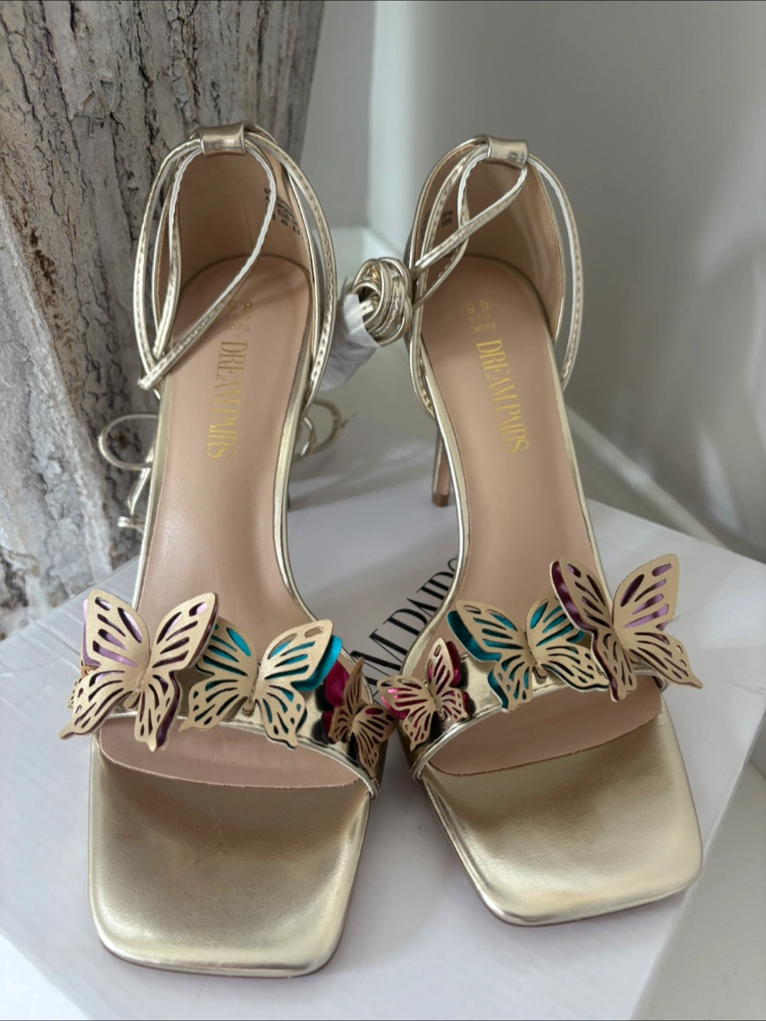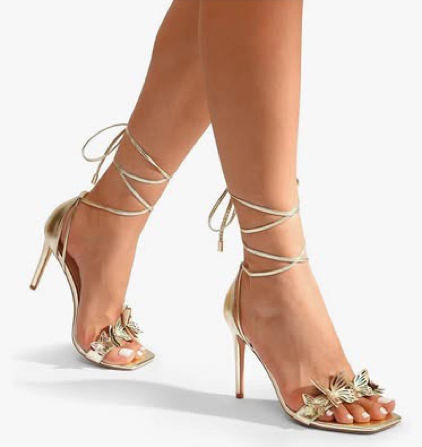 Gold-coloured heels. Delicate butterfly embellishments. Ankle strap tie up. These are so perfect for a special occasion to make you feel like a fairy.