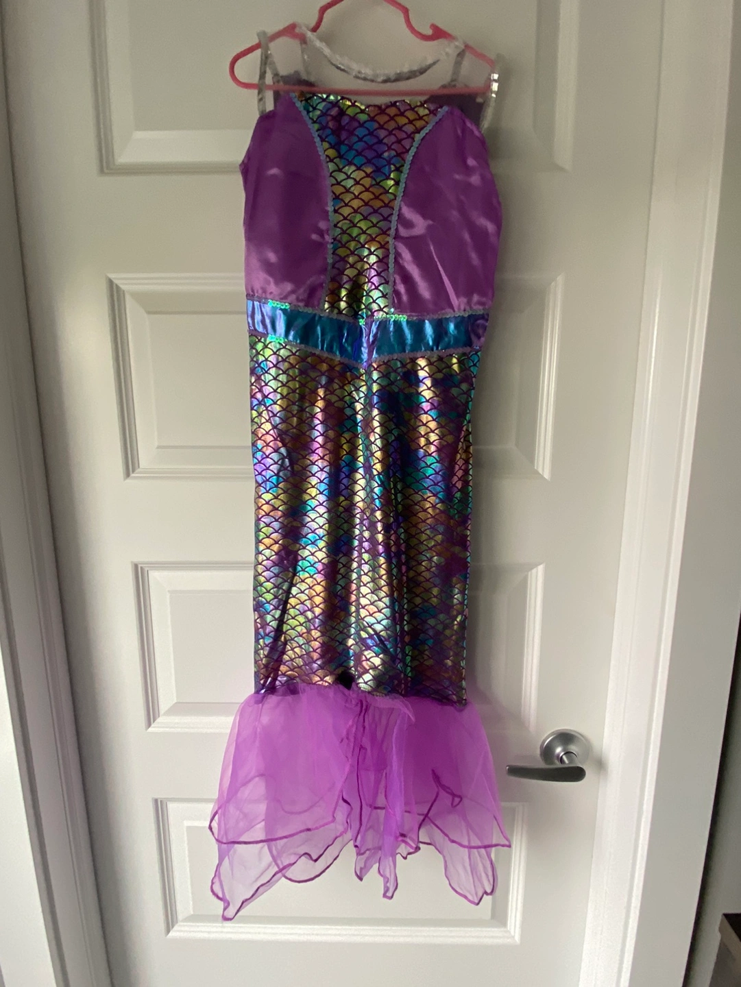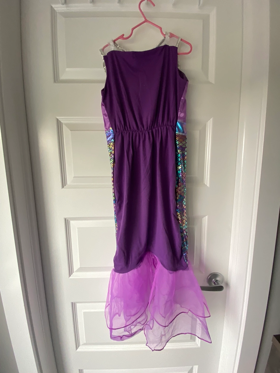 Purple mermaid costume with iridescent scales. The costume features a purple bodice, a tulle tail and a sequined scale print. This costume would be perfect for a mermaid-themed party, Halloween or dress-up. Unfortunately the tulle tail had got stepped on and ripped a little but it should be an easy fix if you can sow.