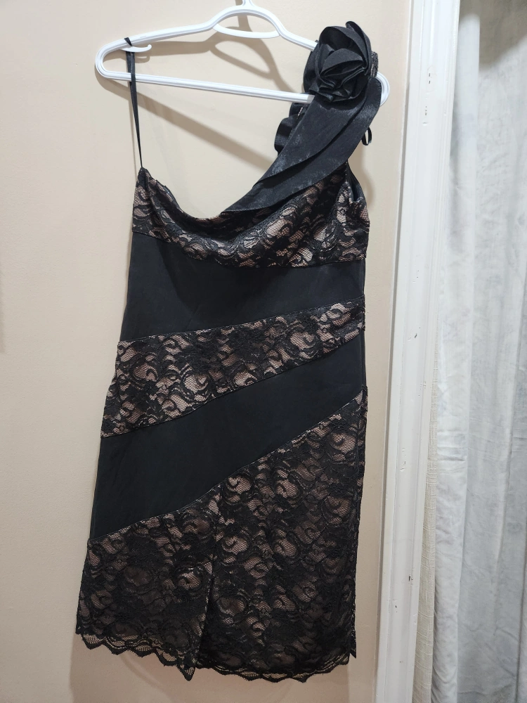 Stunning black and beige cocktail dress. Features one shoulder design and a beautiful lace overlay. Perfect for a special occasion. Rose detail on the shoulder.