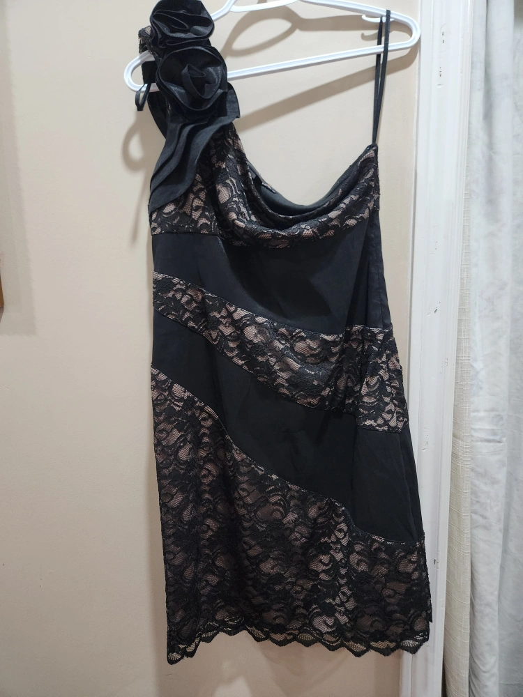 Stunning black and beige cocktail dress. Features one shoulder design and a beautiful lace overlay. Perfect for a special occasion. Rose detail on the shoulder.