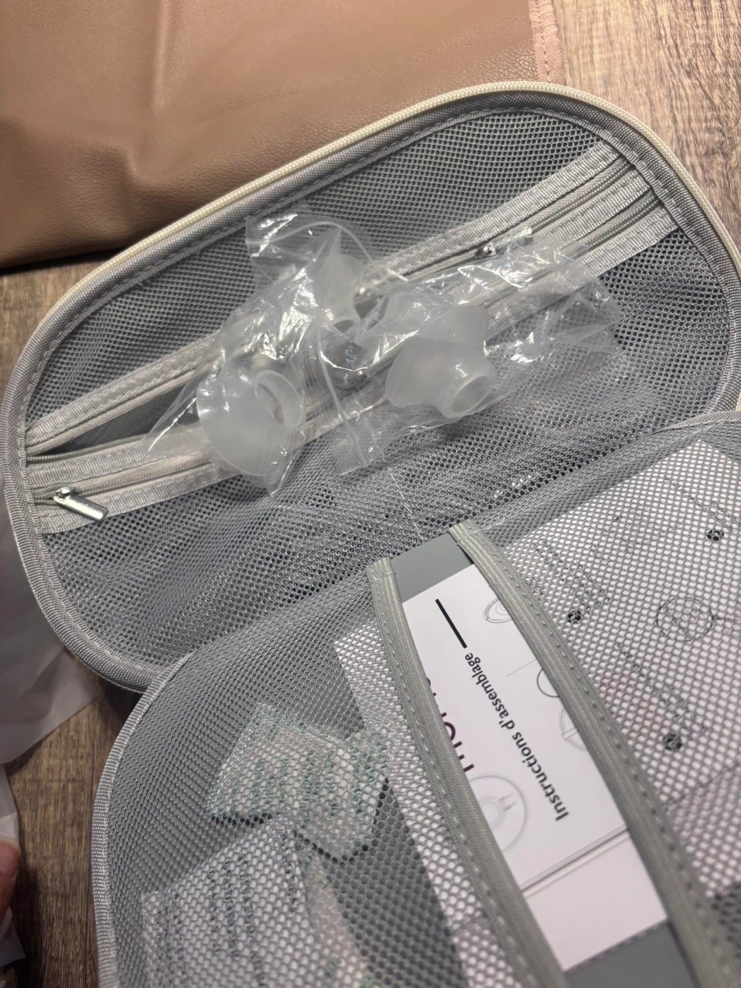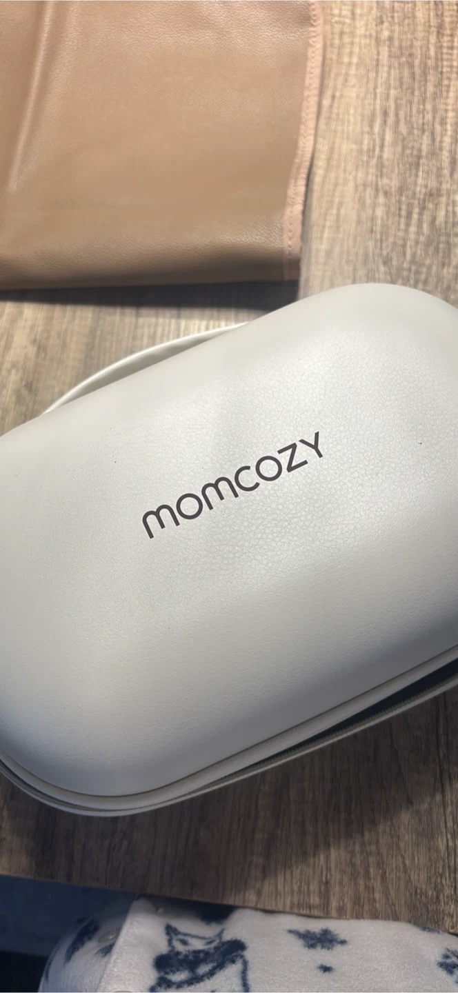This is a Momcozy wearable breast pump set. It includes two pumps and comes in a grey carrying case. Instructions for assembly are included.