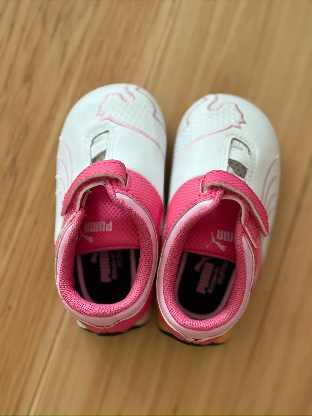 These adorable Puma sneakers are perfect for your little one! They're in great condition and feature a cute pink and white design. The size is US 5T. They have a velcro strap for easy on and off. Perfect for your baby!