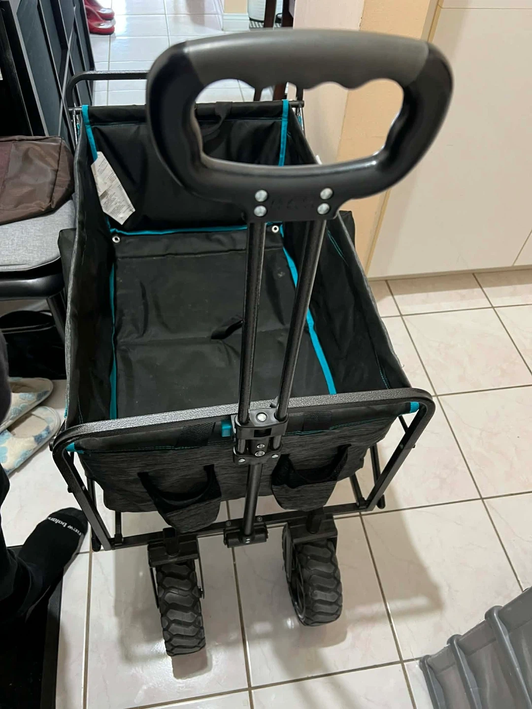 This black folding wagon is great for hauling gear. It's made with durable fabric and features sturdy wheels. Easy to set up and store!