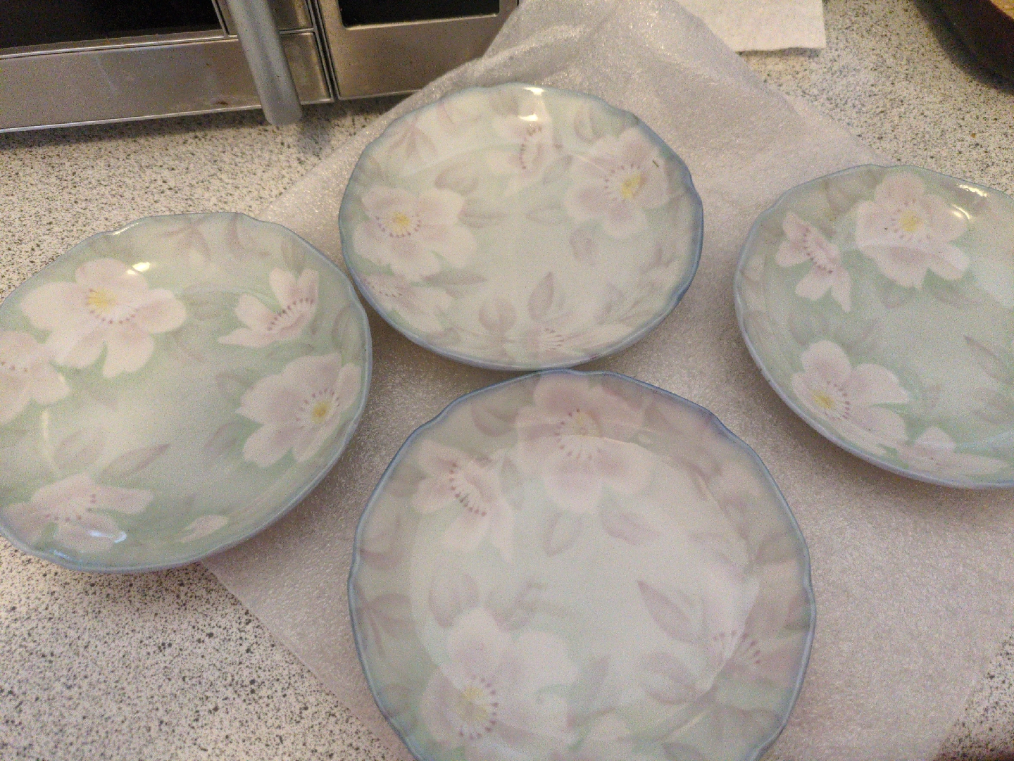 Set of four decorative plates with a delicate floral pattern! They have a soft colour palette and a subtle blue rim, perfect for adding a touch of elegance to your table or display cabinet. It has never been used.