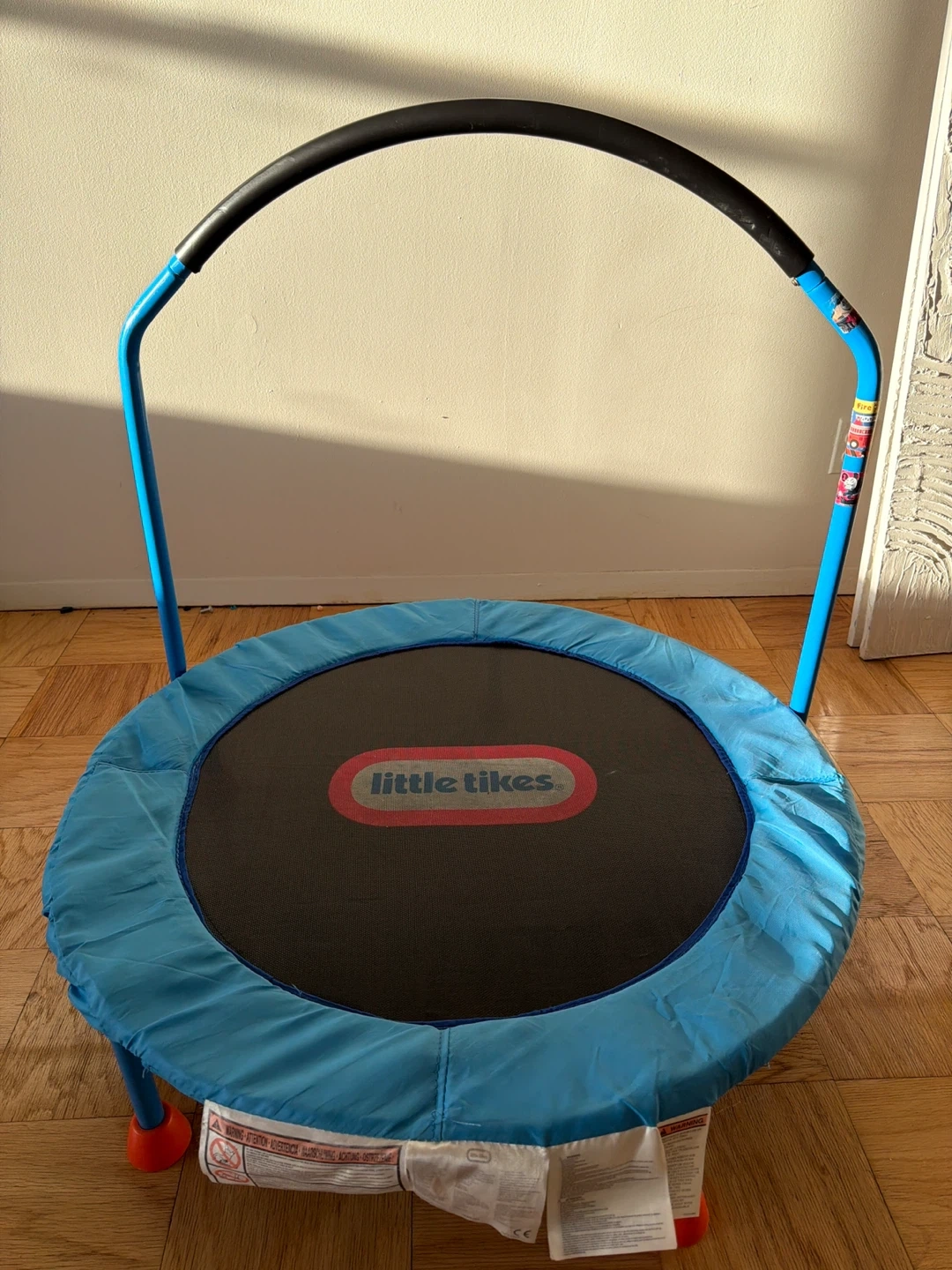 This is a blue Little Tikes toddler trampoline with a padded handlebar. It's made of durable materials for safe bouncing fun. The trampoline is suitable for indoor and outdoor use.