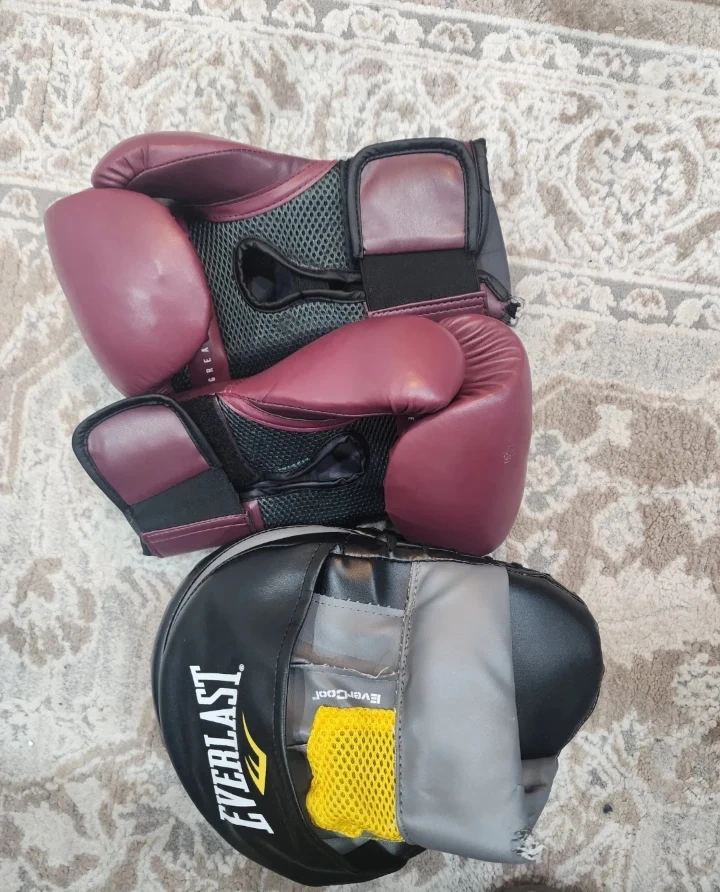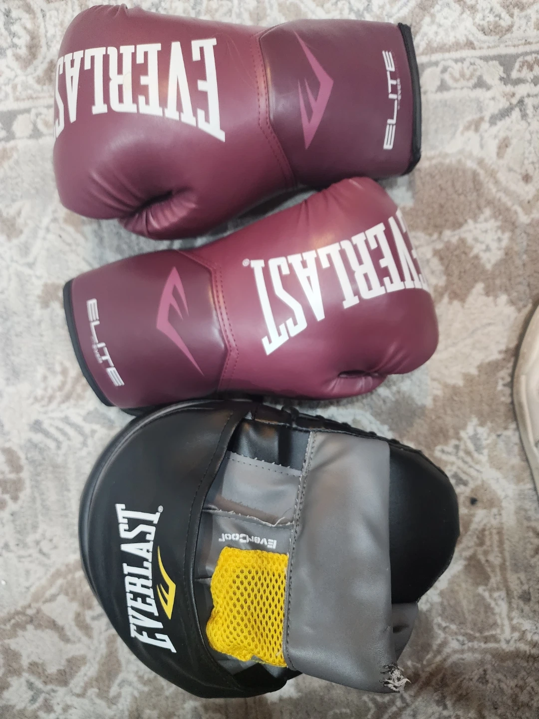 Everlast Elite training gloves and mitts set. Great for boxing or Muay Thai training. The gloves are burgundy and the mitts are black with yellow accents.