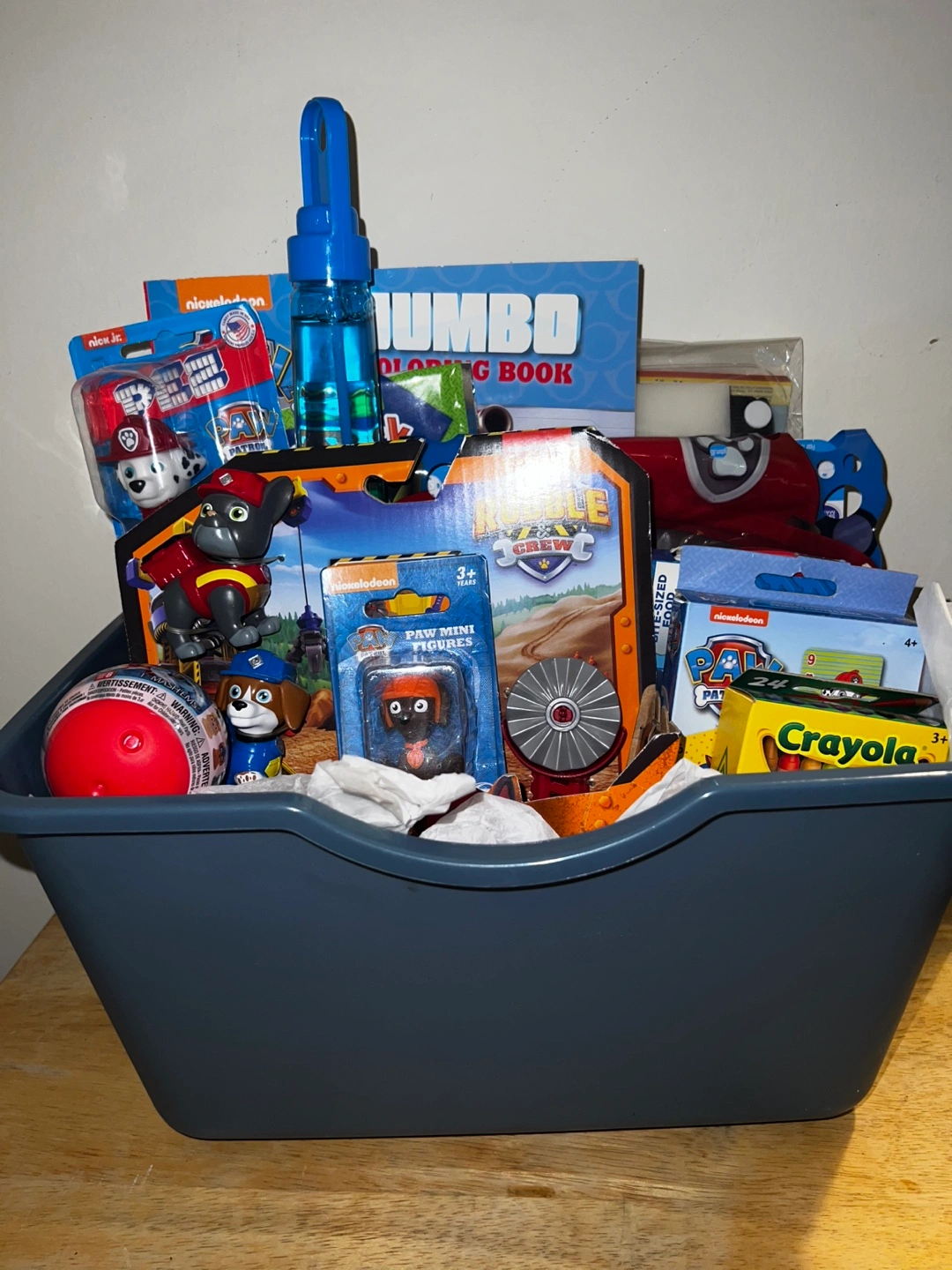 Large gift basket filled with Paw Patrol themed items. Includes mini figures, Rubble & Crew playset, crayons, jumbo coloring book, and more. Great for fans of the show!