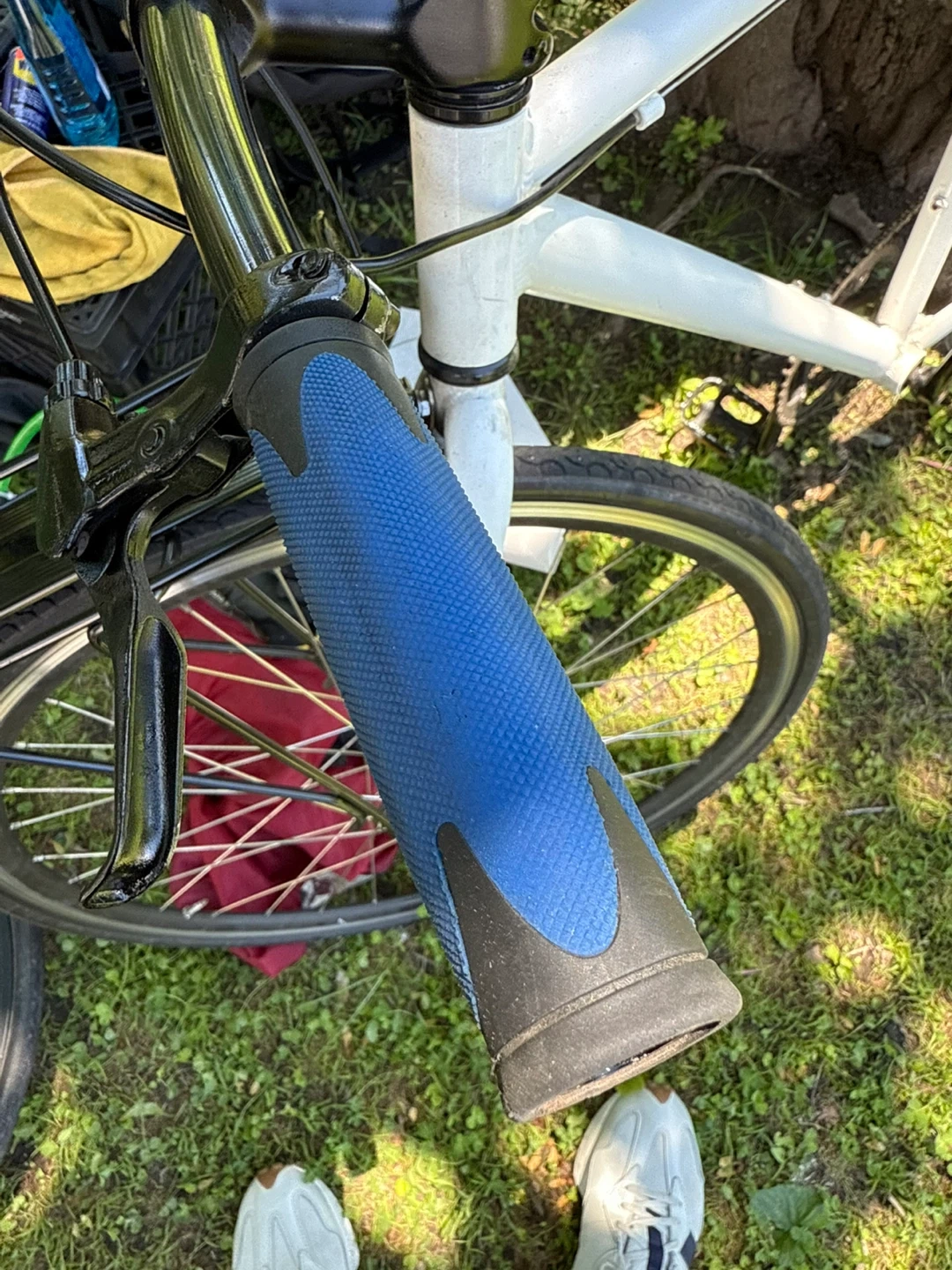 White single-speed bicycle, perfect for city commuting. It has a rear rack for carrying essentials and comfortable blue grip handlebars. Lightweight and easy to maneuver.