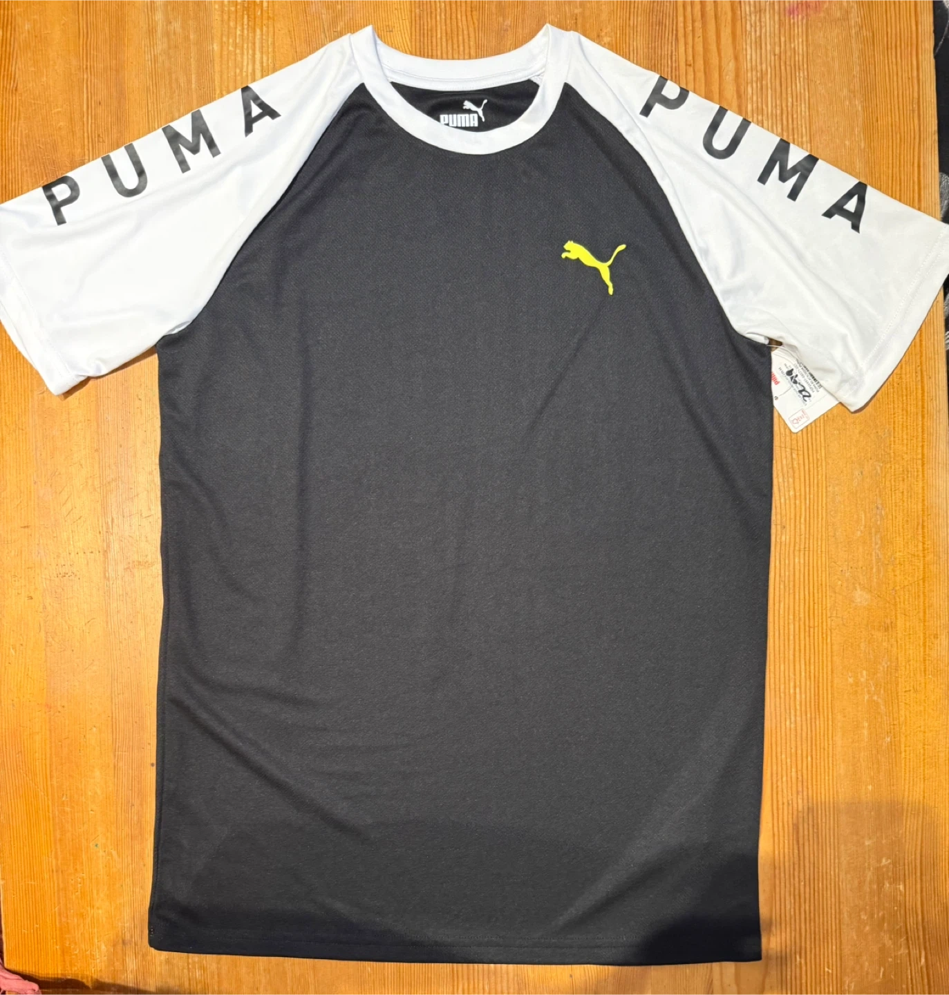 This is a Puma t-shirt with a black body and white sleeves. It has the Puma logo on the chest and "PUMA" text printed on the sleeves. It's made of a lightweight, breathable fabric.