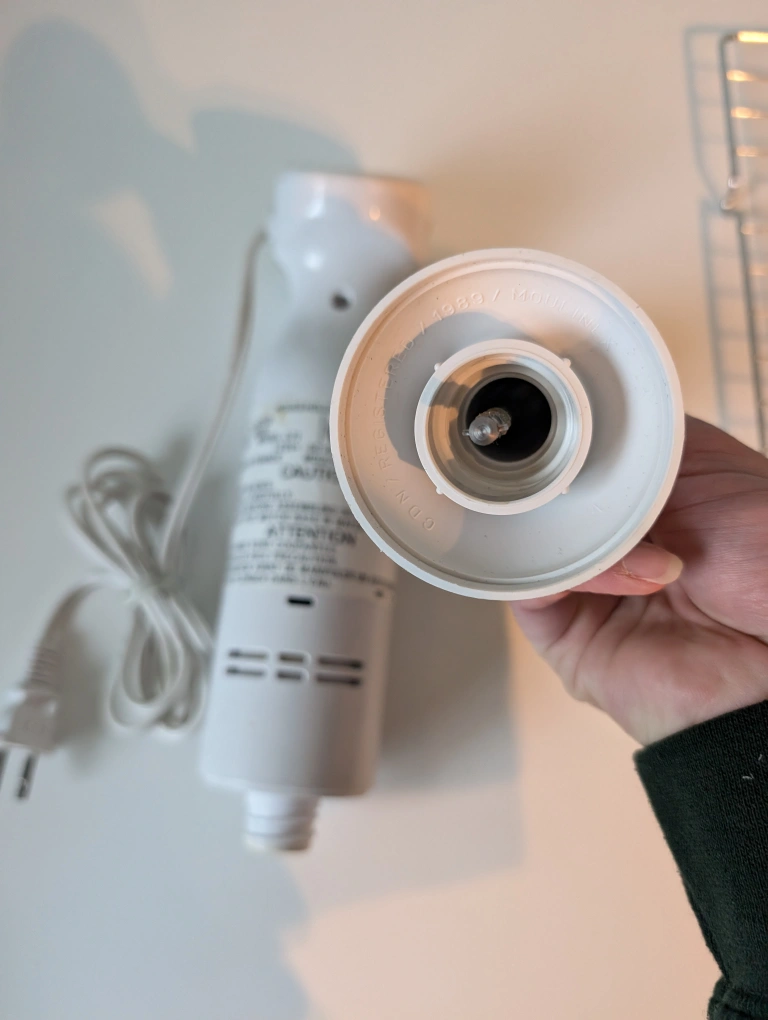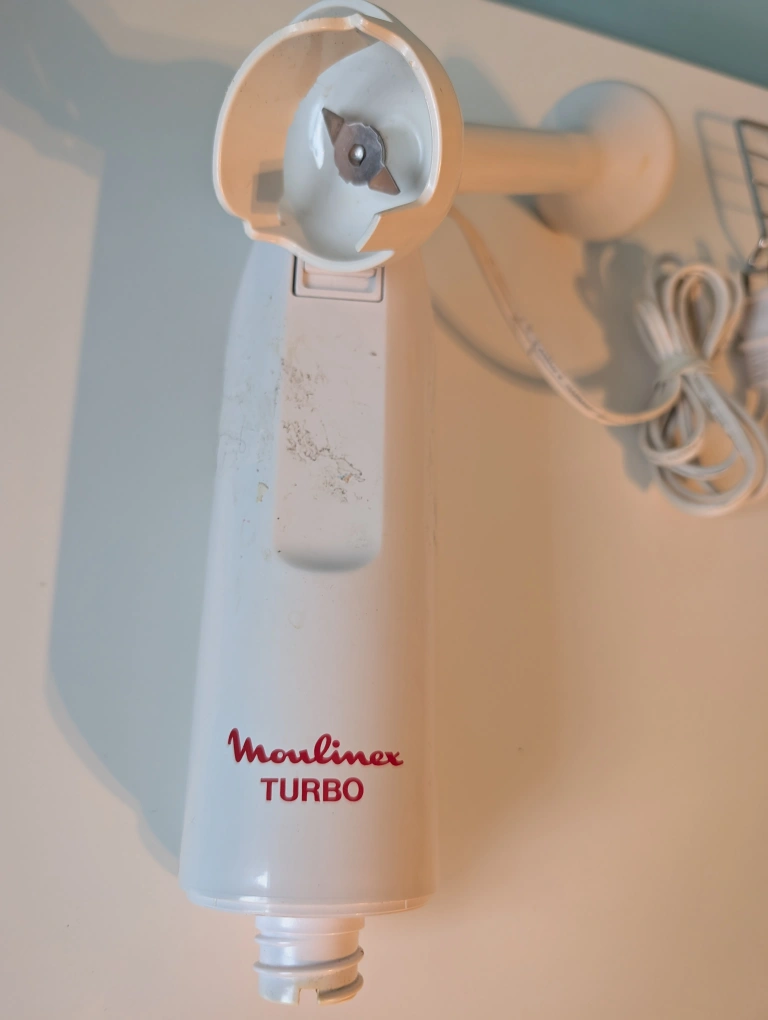 White hand blender with a cord and a detachable blade. Includes an extra attachment for blending.