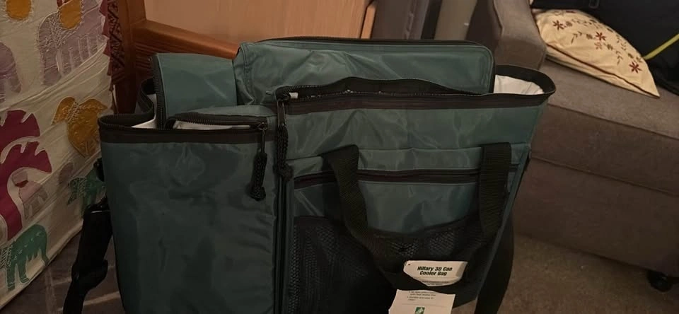 Handy Hillary 30 Can Cooler Bag. Keeps contents cool for hours with inner foam insulation. Lightweight and collapsible for convenient storage. Has no-leak nylon construction with a heat-sealed liner. Durable and easy to clean. Pickup/ Cash only. SE Vancouver. Victoria Drive & E 61 Ave.