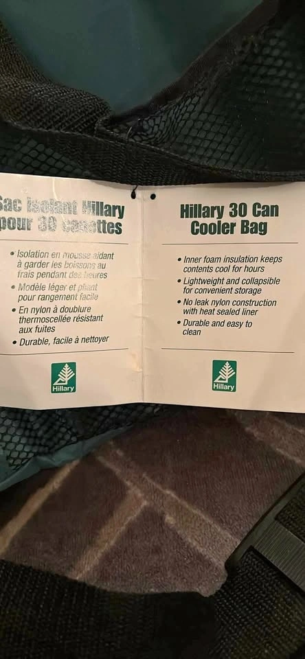 Handy Hillary 30 Can Cooler Bag. Keeps contents cool for hours with inner foam insulation. Lightweight and collapsible for convenient storage. Has no-leak nylon construction with a heat-sealed liner. Durable and easy to clean. Pickup/ Cash only. SE Vancouver. Victoria Drive & E 61 Ave.