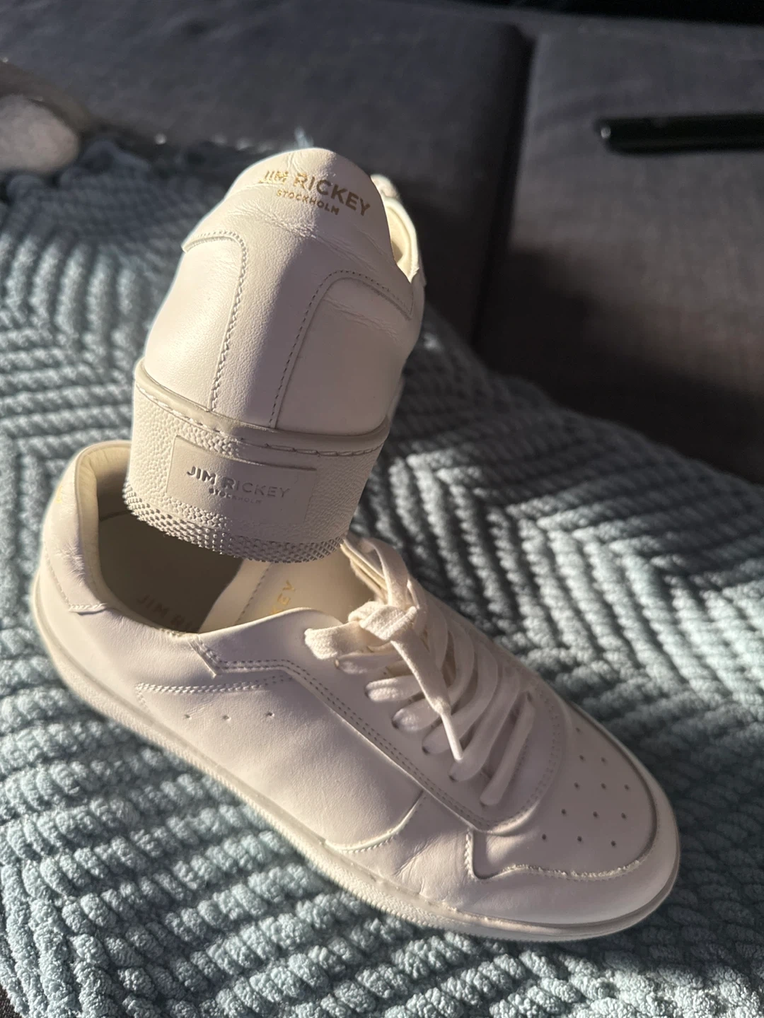 White leather sneakers from Jim Rickey Stockholm. Model STL: WING, ART: JR-WING-W-COW-WHITE. These shoes are handmade in Portugal. Size is US 7, EU 38.