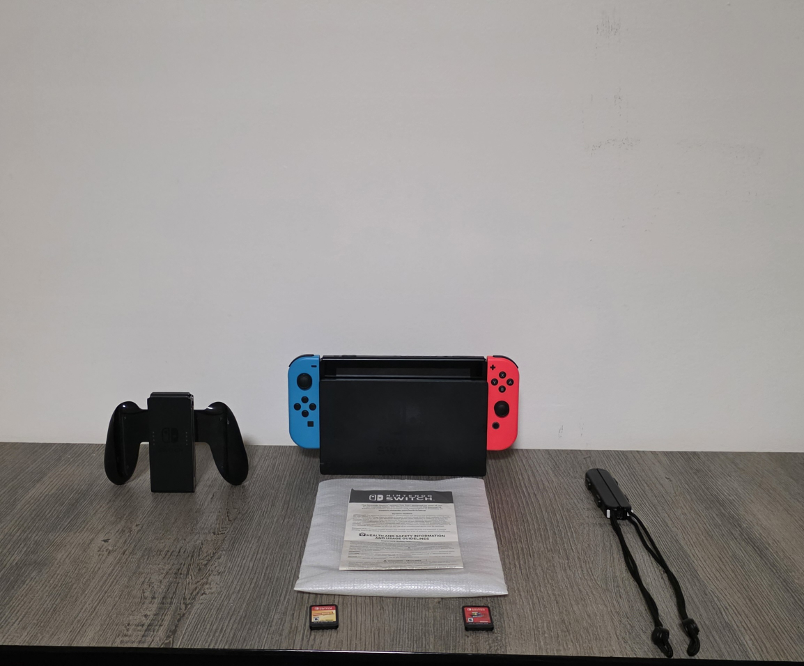 Selling a Nintendo Switch console in great condition! It comes with the dock, Joy-Con controllers, handheld controller grips, and two games (Super Mario Odyssey and Fitness Boxing 2). Also included is the original instruction manual and the foam bag to keep the accessories. All items are completely functional without invasive defects. Perfect for gaming on the go or at home!