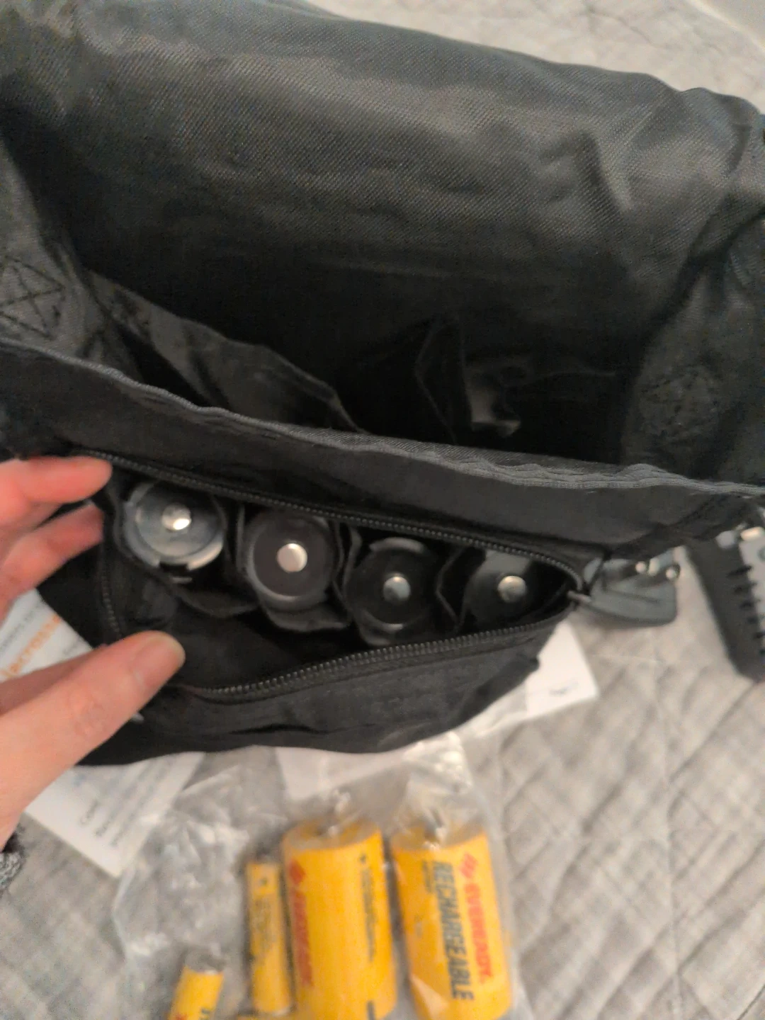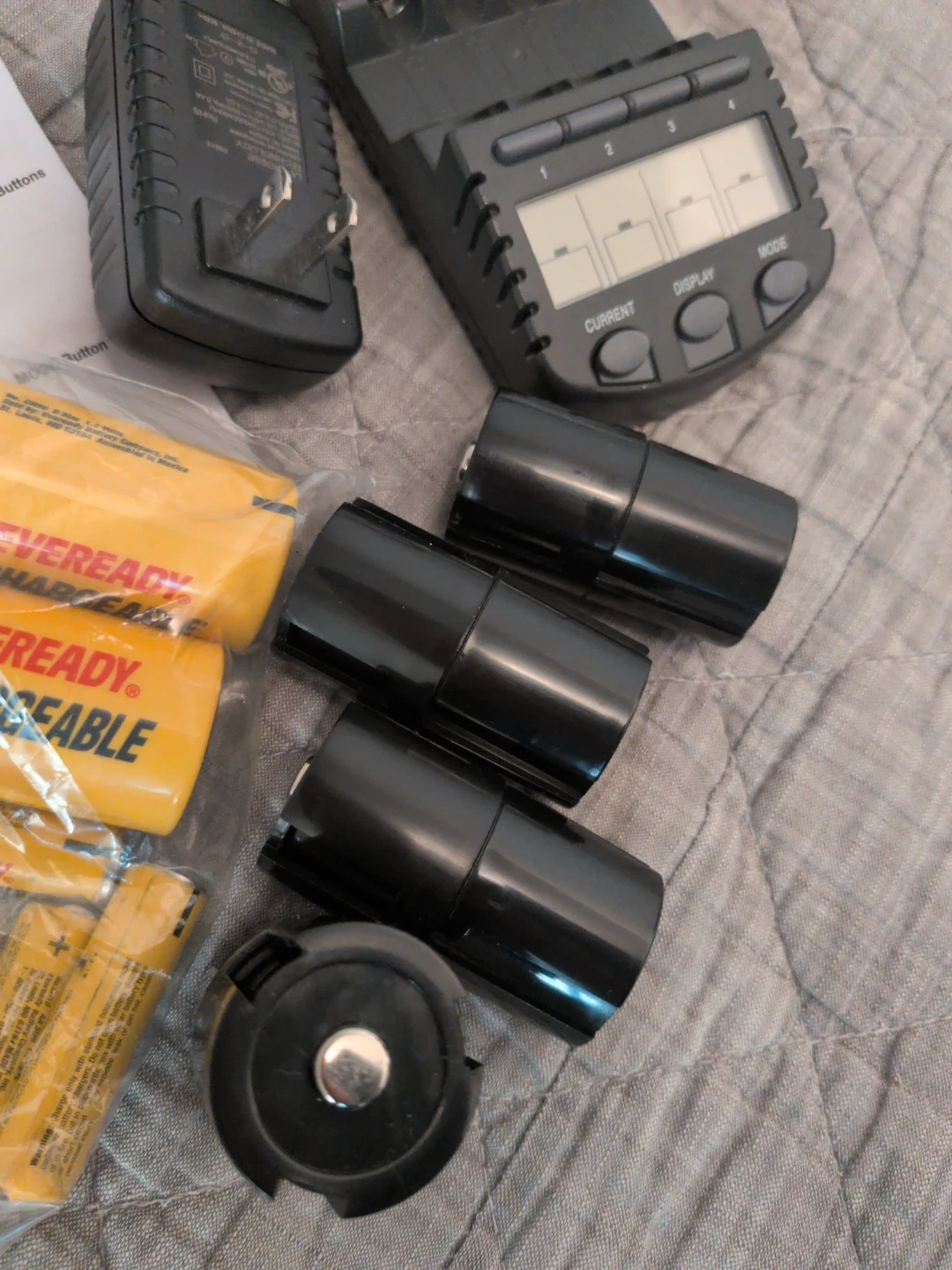 This is a La Crosse Technology BC1000 Alpha Power Battery Charger. It includes the charger, power adapter, carrying case, and several rechargeable AA and AAA batteries. The charger displays current battery levels and modes.