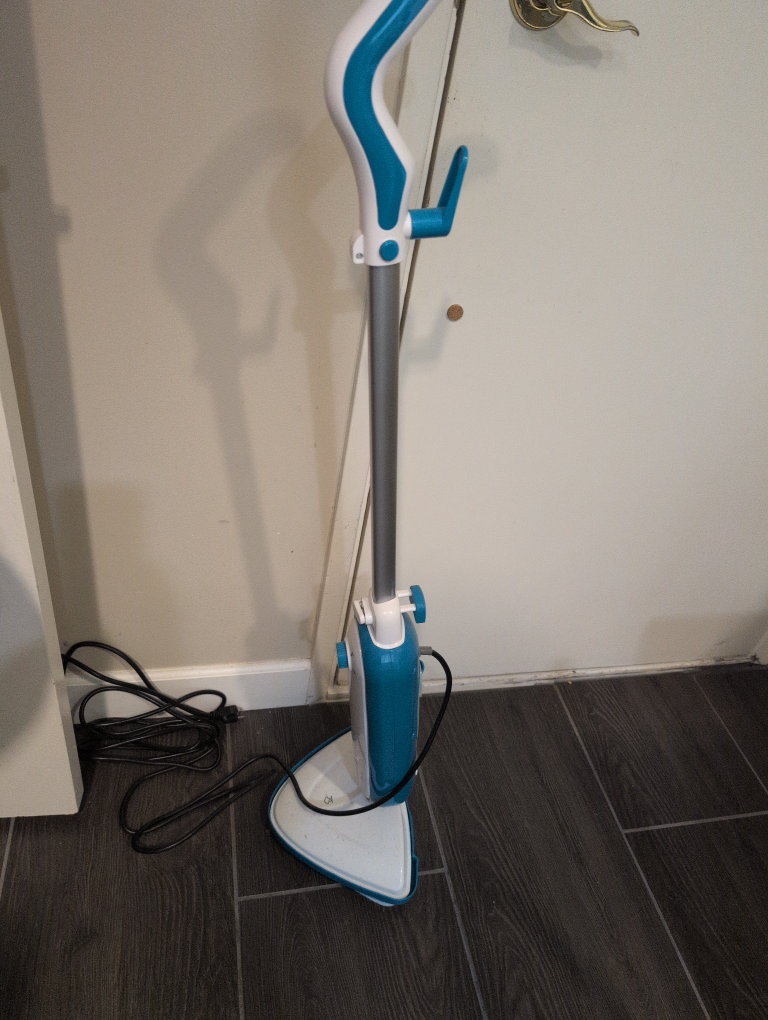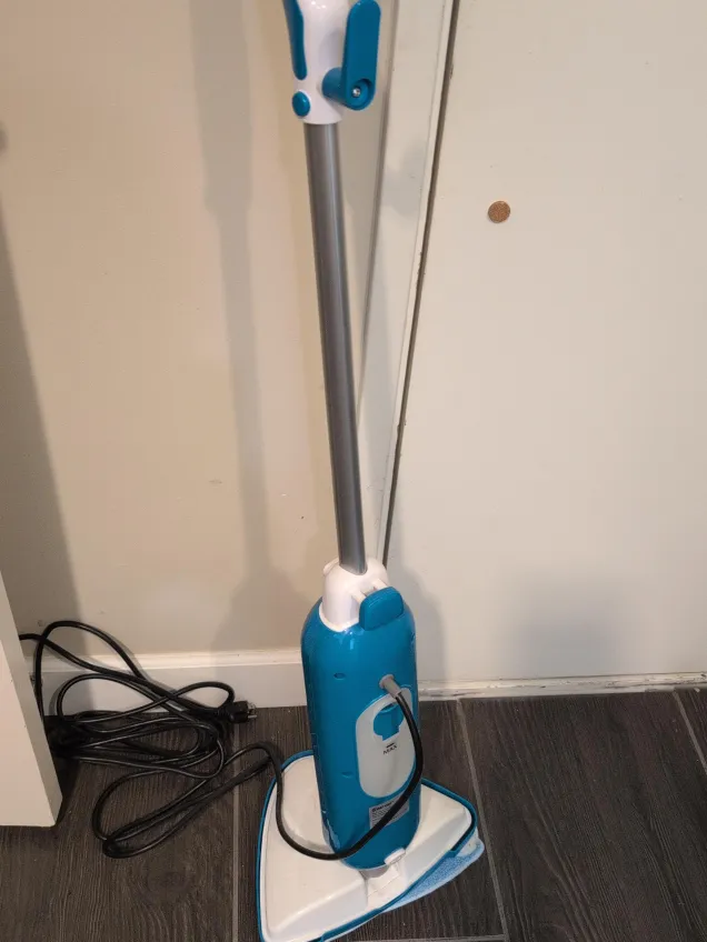 Selling a Costway steam mop in great condition! It's perfect for cleaning hard floors and is easy to use. The mop features a blue and white design and comes with a triangular mop head for reaching corners. It's a lightweight and convenient way to keep your floors sparkling clean!