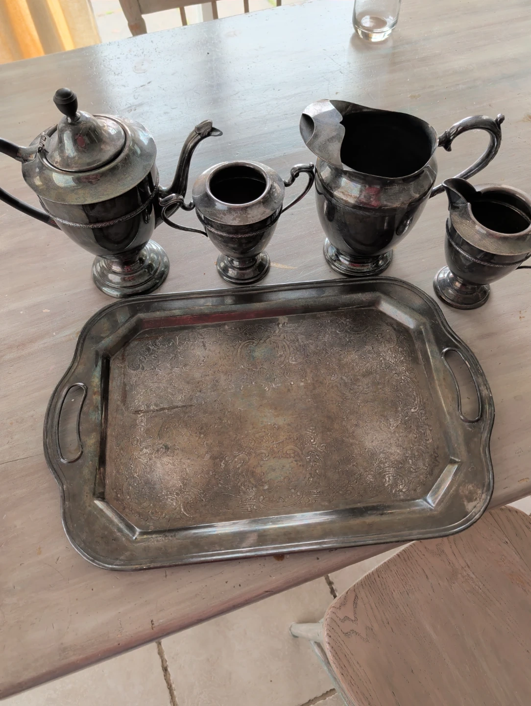 This four-piece silver-plated tea set includes a teapot, creamer, sugar bowl, and a matching tray. It's marked EPBM with the number 1490. Perfect for serving guests or as a decorative piece!