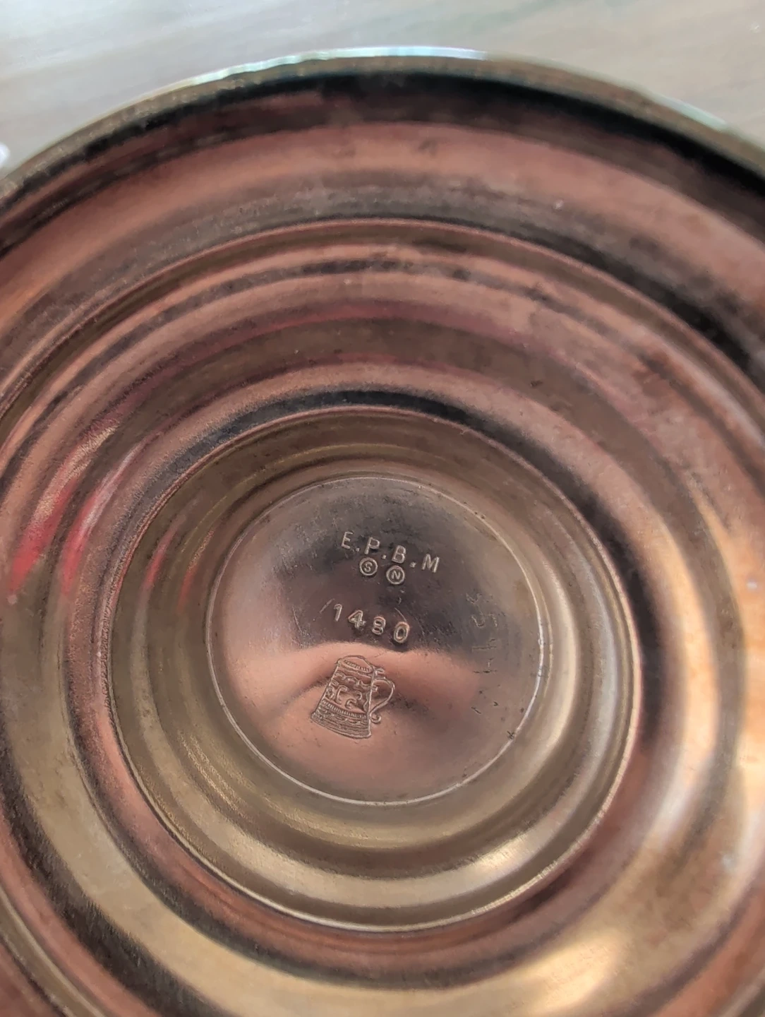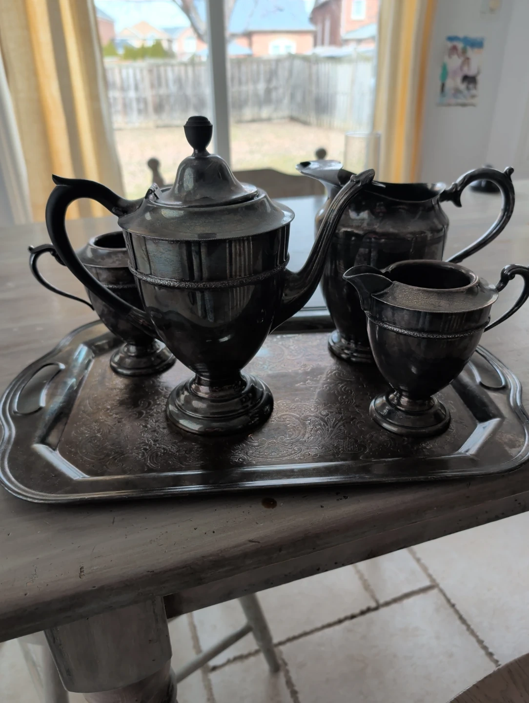 This four-piece silver-plated tea set includes a teapot, creamer, sugar bowl, and a matching tray. It's marked EPBM with the number 1490. Perfect for serving guests or as a decorative piece!