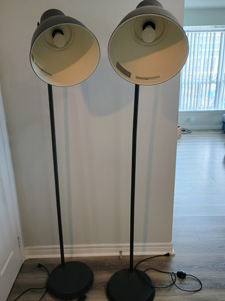 Two IKEA HEKTAR floor lamps, dark grey. Excellent condition. Adjustable shade. Simple, modern design. Perfect for living room or bedroom.
