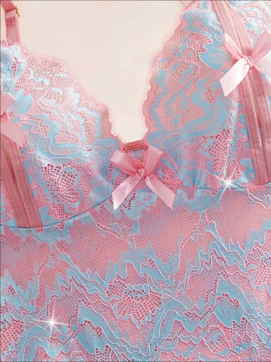 A pretty pink and blue lace bralette and matching shorts set. Includes adjustable straps and bow details. This set is a size medium.