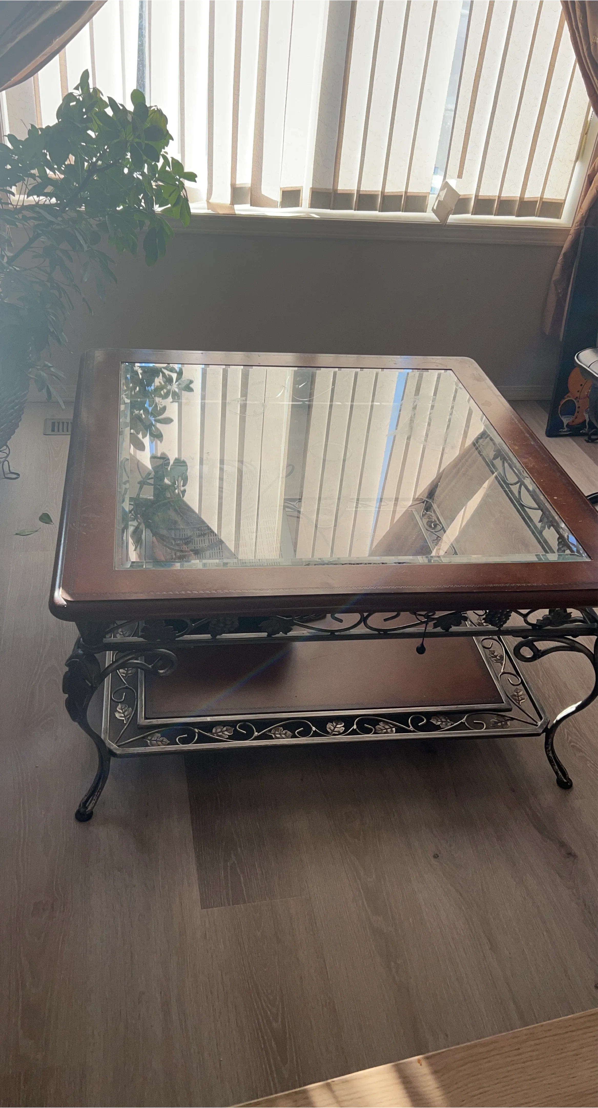 A stylish coffee table featuring a decorative metal frame and a clear glass top. It has a lower shelf for extra storage space. Its ornate metal legs add a decorative touch. This table is perfect for a living room or den.