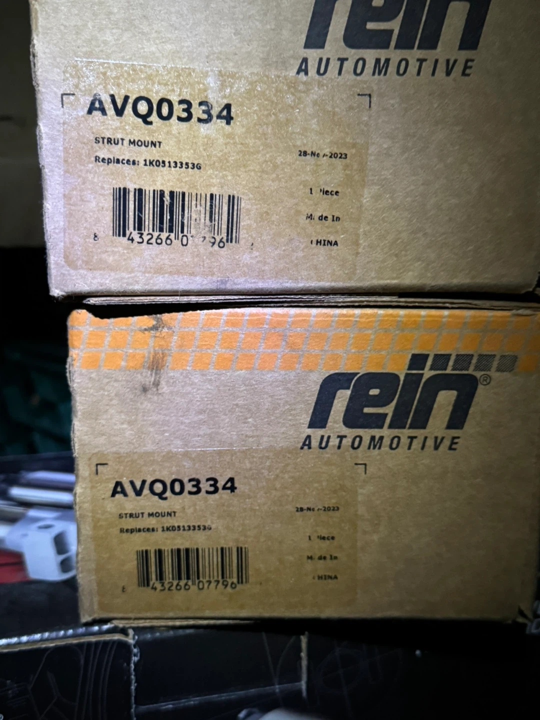 Rein Automotive strut mount, part number AVQ0334. It's new in the box and includes the original packaging. This part replaces OE number 1K0513536G. Manufactured November 28, 2023. Located in Penticton