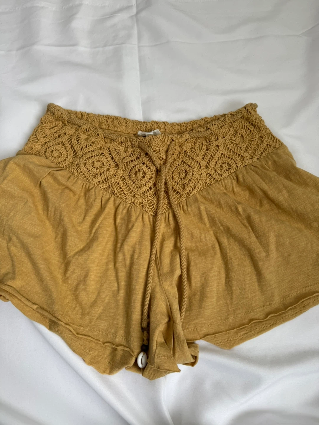 Cute mustard yellow shorts with a crochet waistband and drawstring. These shorts are a size XS and made from a soft, lightweight fabric. Perfect for warm weather days!
