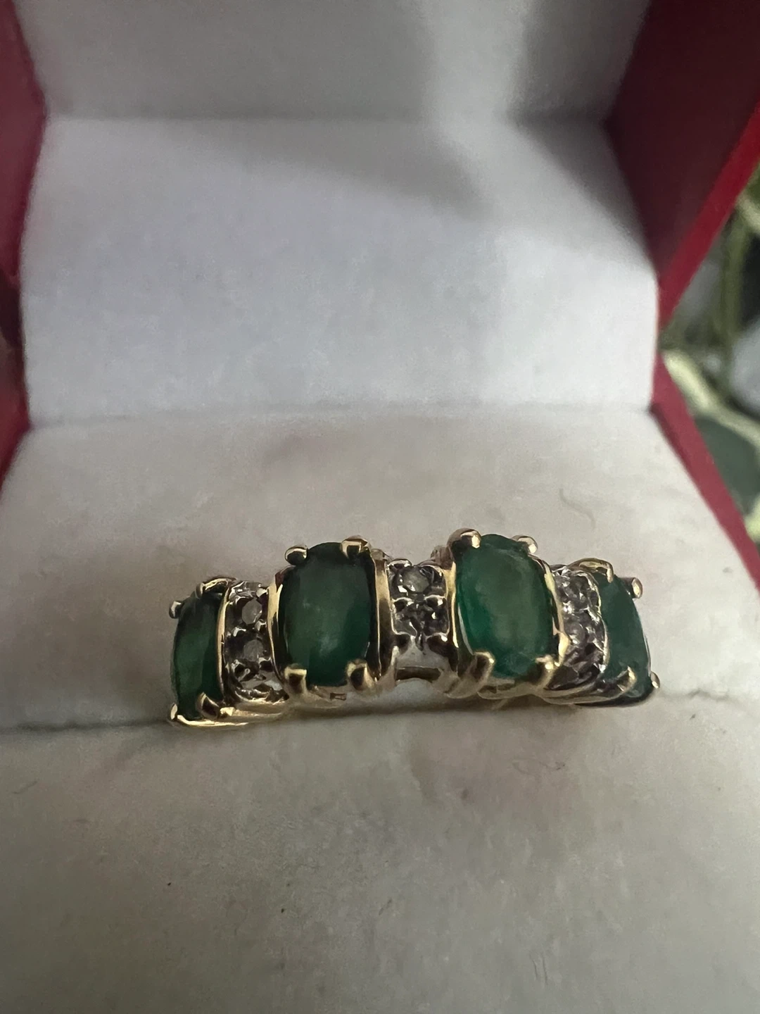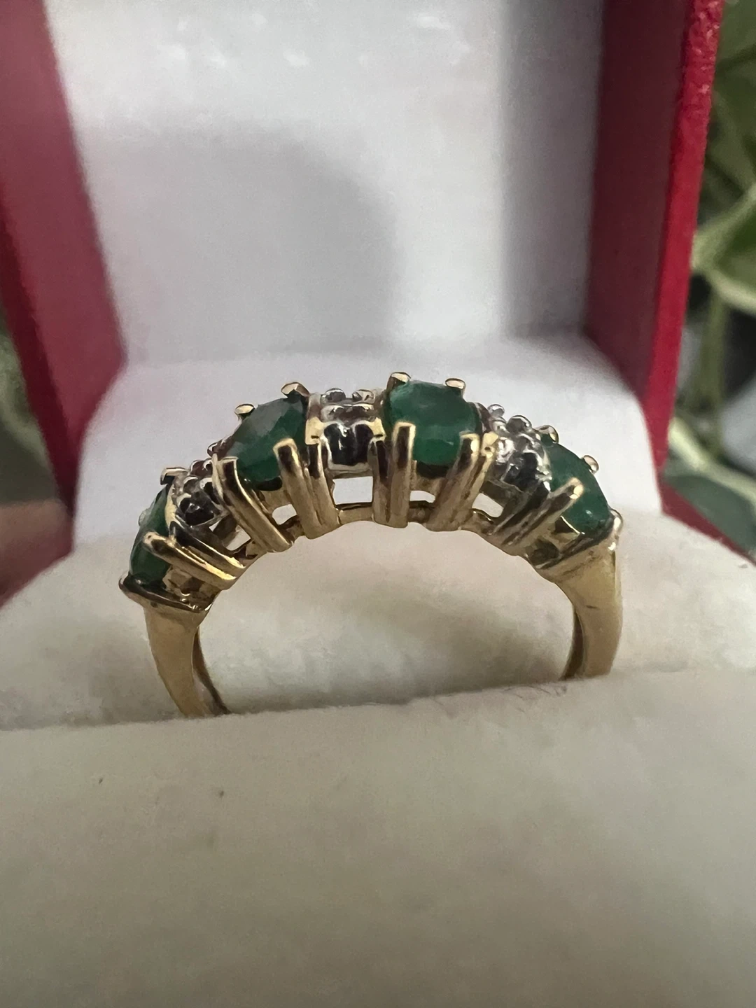 A beautiful 14k gold ring featuring five oval emeralds interspersed with small diamonds. This ring's classic design makes it a lovely addition to any jewelry collection. It's perfect for anniversaries or special occasions!